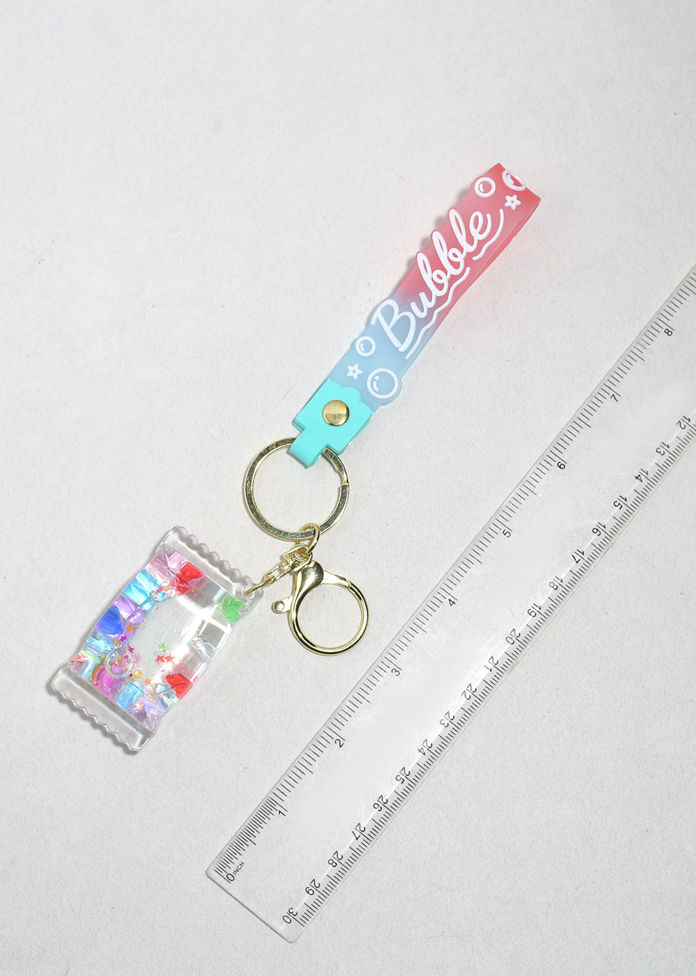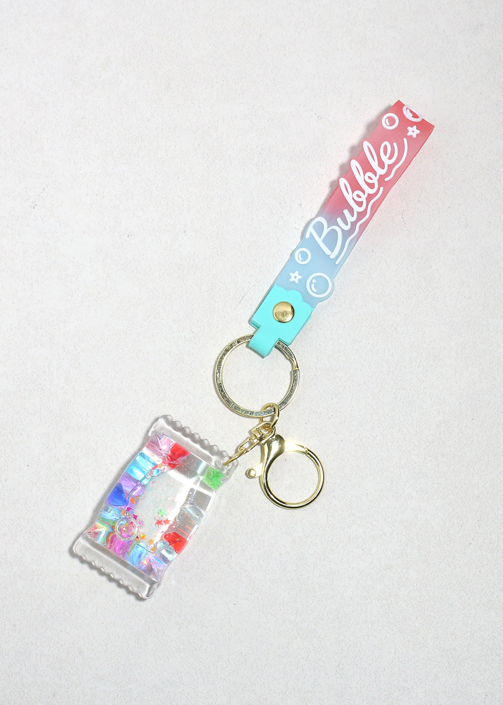 Add a pop of sweetness to your everyday essentials with our Bubble Pop Candy Keychain. Featuring a dreamy pink-to-blue gradient strap with playful “Bubble” lettering, this adorable accessory is finished with a clear candy-shaped charm filled with colorful confetti, glitter, and star details for a fun, eye-catching touch.