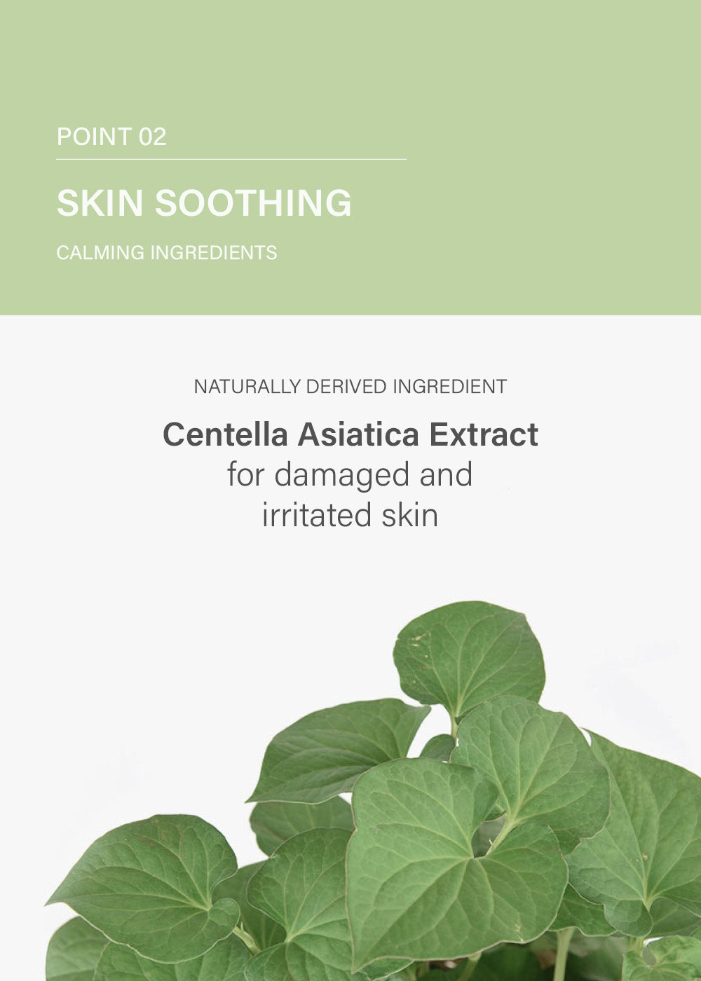 - Centella Asiatica Extract promotes outstanding skin-soothing effect.
