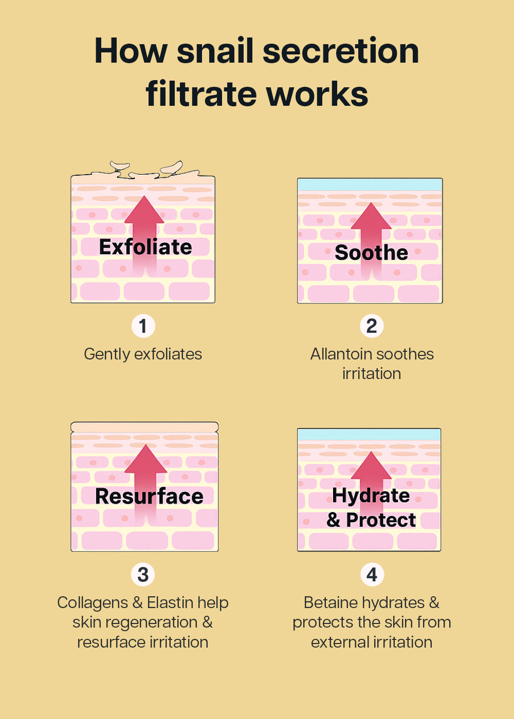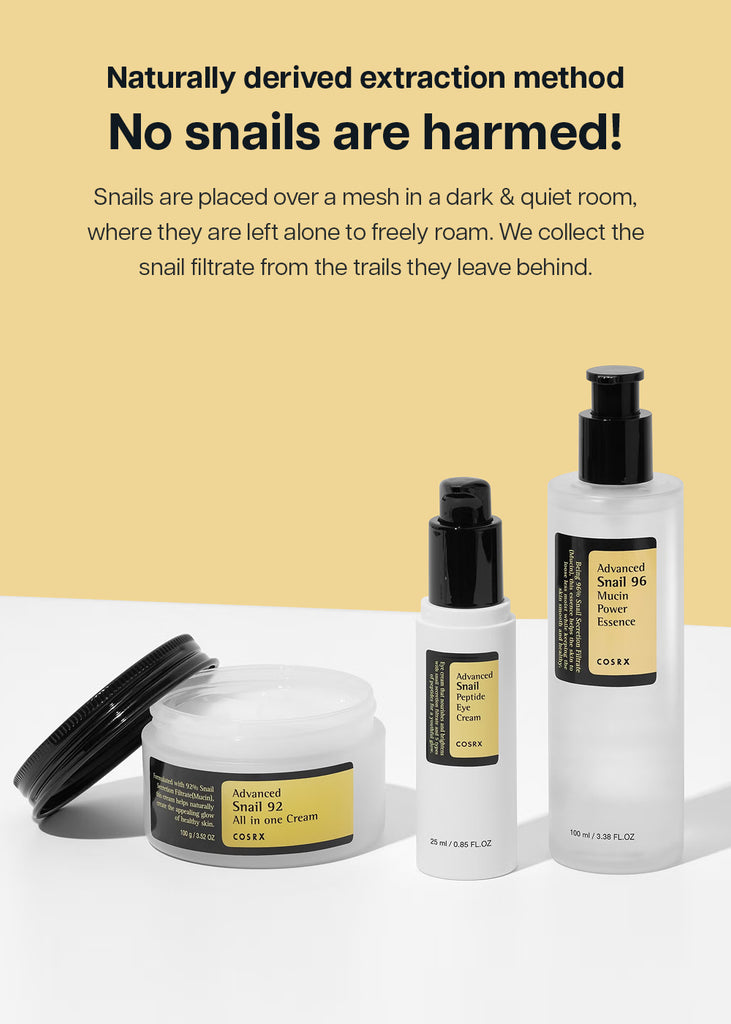 Snail Secretion Filtrate, Butylene Glycol, Glycerin, Helianthus Annuus (Sunflower) Seed Oil, 1,2-Hexanediol, Niacinamide, Water, Palmitic Acid, Arginine, Carbomer, Stearic Acid, Betaine, Cetearyl Olivate, Sorbitan Olivate, Sodium Polyacrylate, Allantoin, Tocopheryl Acetate, Panthenol, Hydroxyethyl Acrylate/Sodium Acryloyldimethyl Taurate Copolymer, Sodium Hyaluronate, Adenosine, Xanthan Gum, Myristic Acid, Copper Tripeptide-1, Acetyl Hexapeptide-8, Palmitoyl Pentapeptide-4, Palmitoyl Tripeptide-1, Palmitoyl Tetrapeptide-7