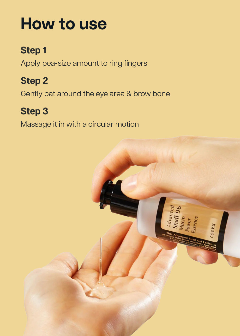 Apply after using essence/serum/ampoule around your eyes. Massage around eyes and tap the area gently for better absorption.