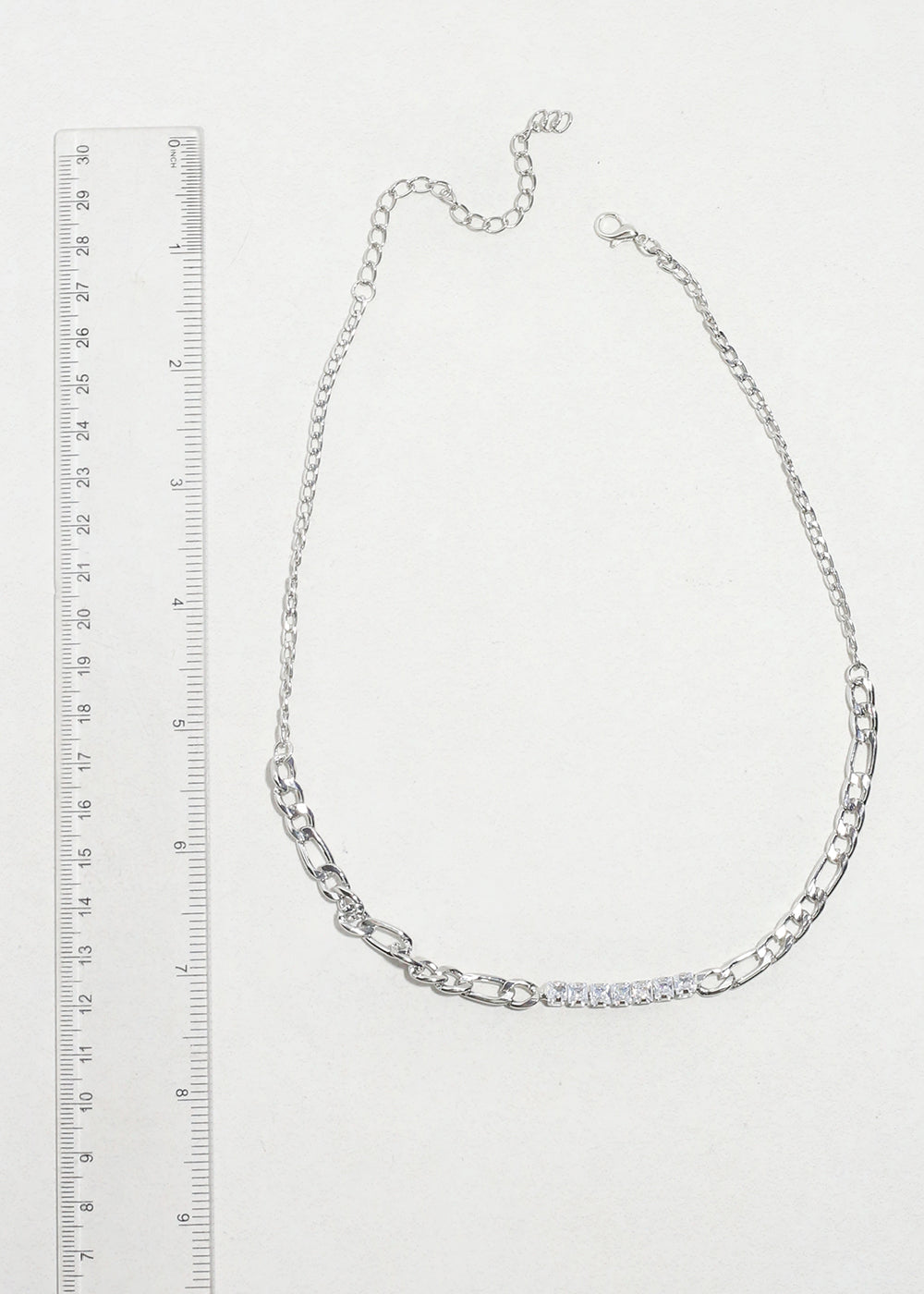 Add effortless elegance to your jewelry collection with this silver linked chain necklace, featuring a modern mix of bold links and a sparkling crystal-like gem bar centerpiece. The unique design combines edgy chain style with a touch of refined sparkle, making it the perfect accessory for both casual outfits and dressy occasions.