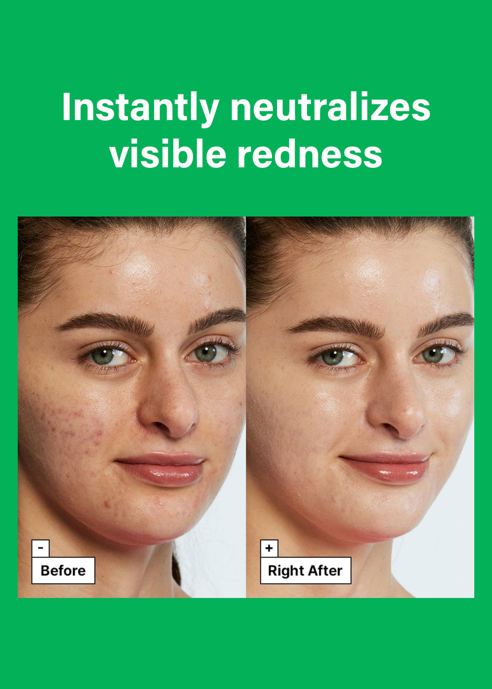 - Press and blend into the skin. The cream will change from green to beige, evening out skin tone.