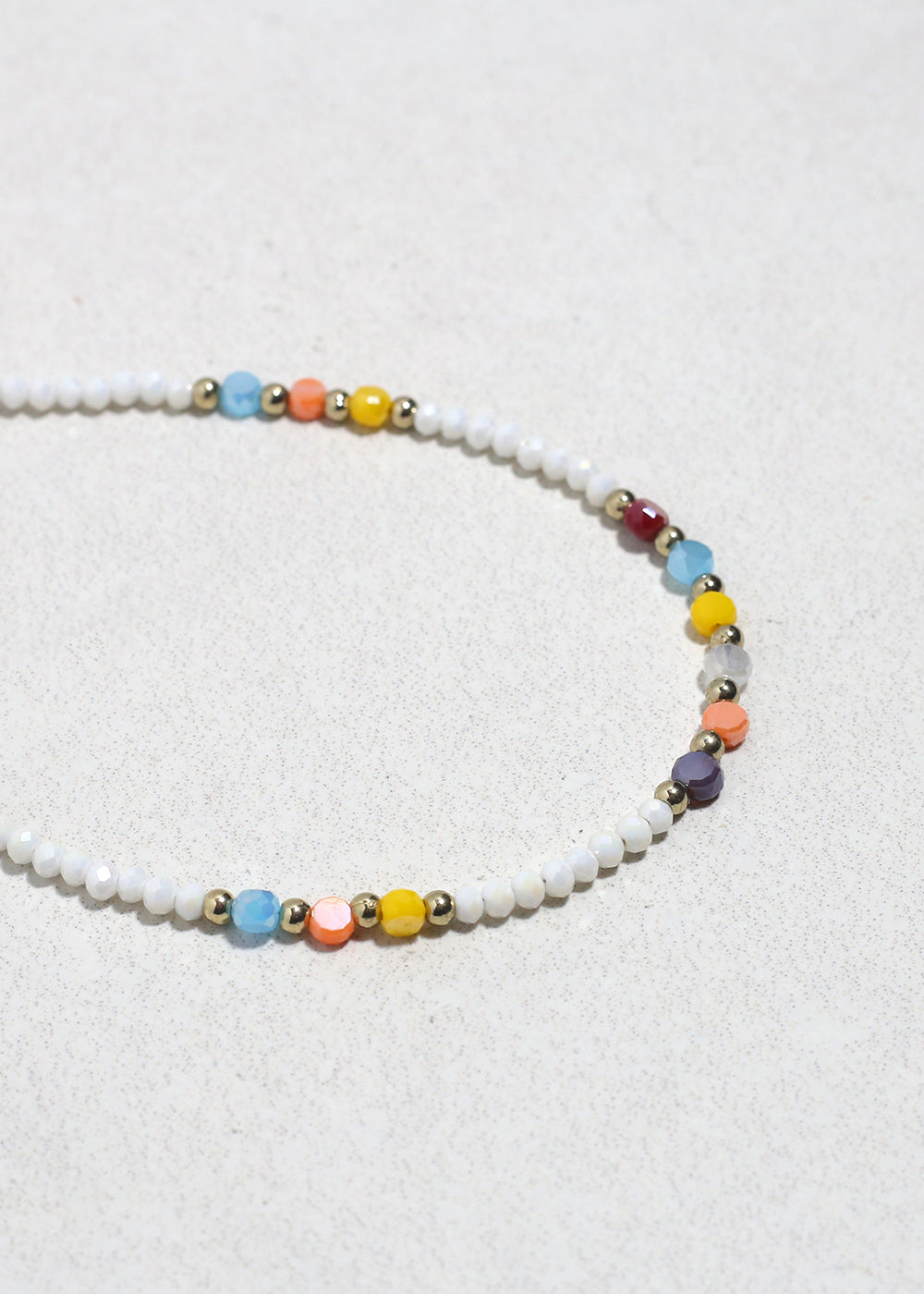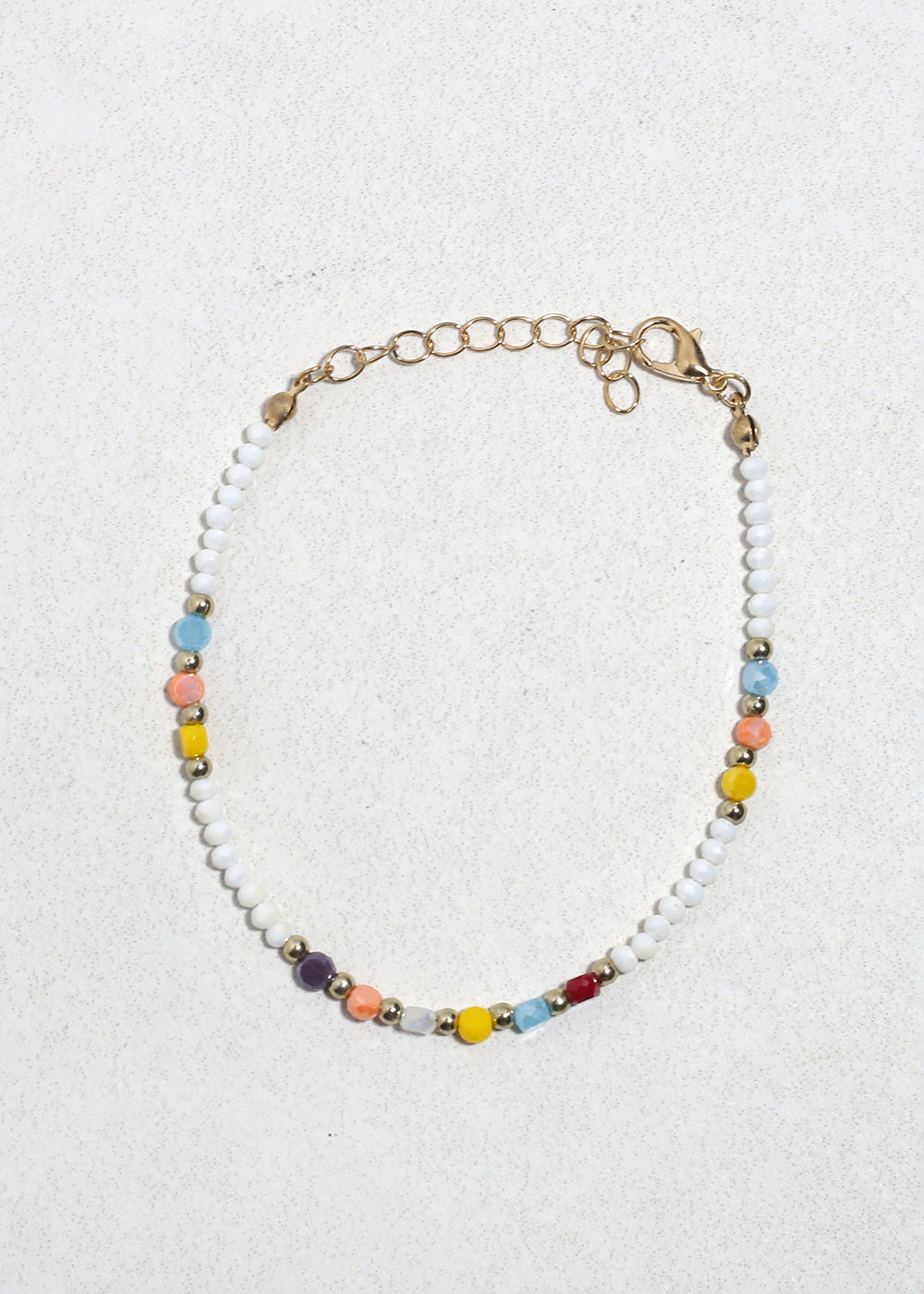 Add a soft pop of color to your everyday look with the Everyday Joy Beaded Bracelet. Designed with delicate white beads and subtle multicolor accents, this bracelet brings a playful yet minimal charm that’s easy to style with any outfit. Gold-tone spacer beads add a touch of elegance, making it perfect for both casual wear and layered looks.