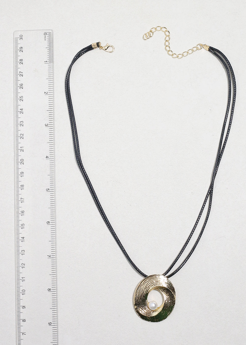 Elevate your look with our Golden Swirl Pearl Pendant Necklace — a modern twist on timeless elegance. This stunning piece features a textured gold-tone circular pendant accented with a dainty faux pearl, symbolizing balance and sophistication. The pendant rests on a sleek black double-cord necklace, creating a striking contrast that’s both chic and versatile.