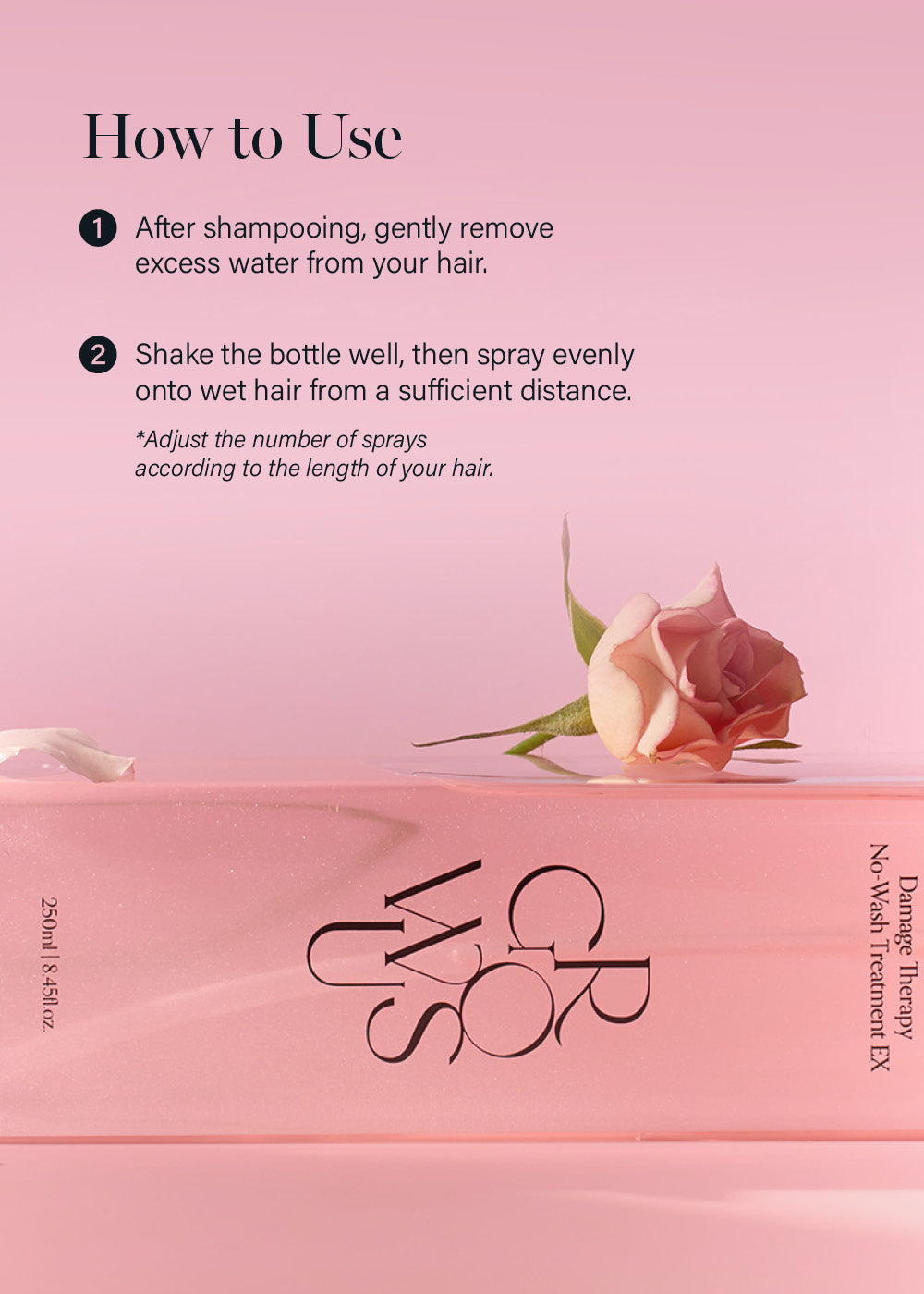 After shampooing, spray evenly at a distance of 10~15cm mainly for damaged and tangled hair in towel-dried wet hair, then dry.
