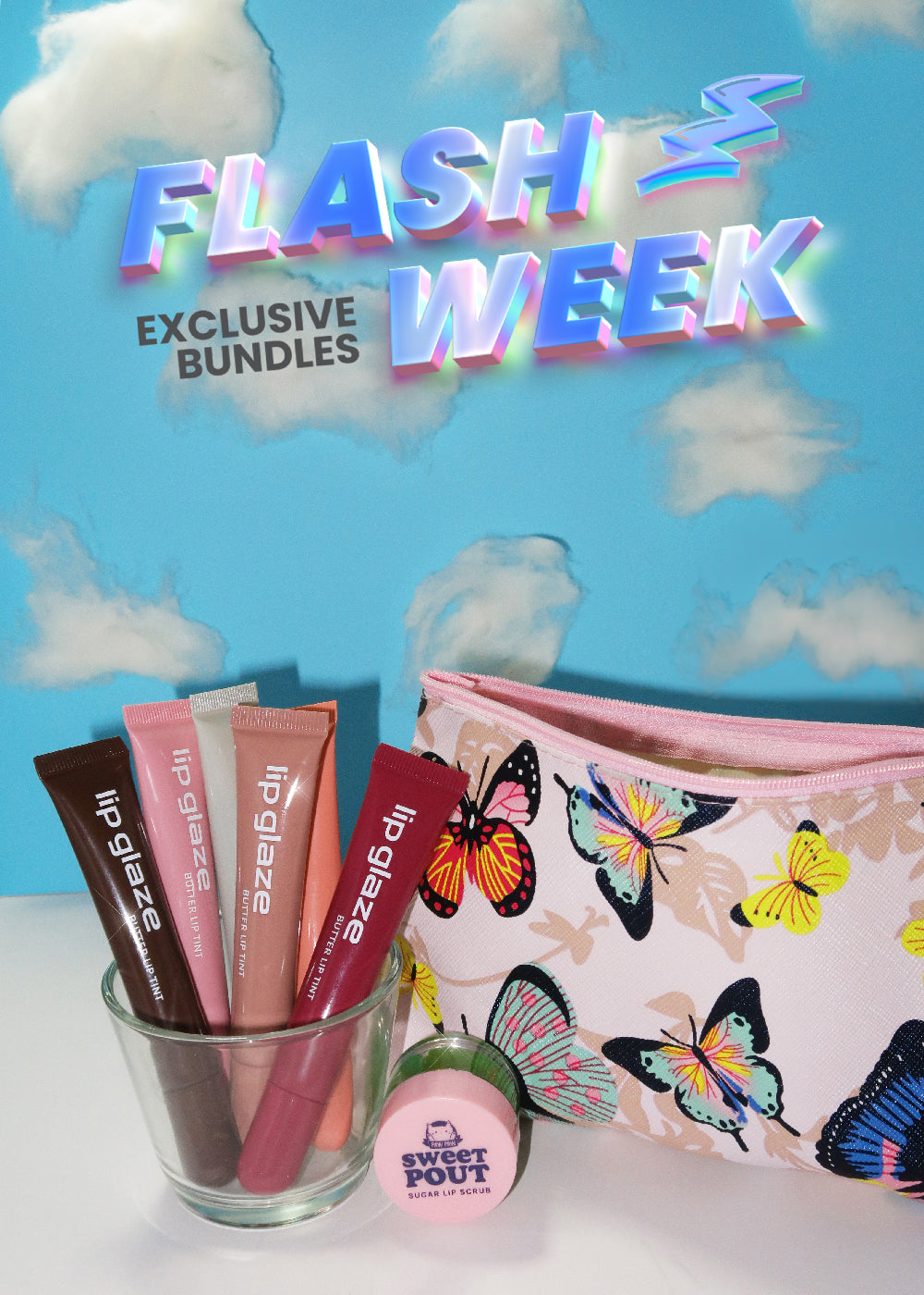 The Happy Holi-Glaze set includes all of our best-selling AOA Lip Glaze Butter Lip Tints. Creamy, glossy, and ultra-hydrating. To top it off, we’ve added a Lip Scrub to keep your lips baby-soft and smooth all season long and a cute little Butterfly a2o Lab Makeup Pouch.