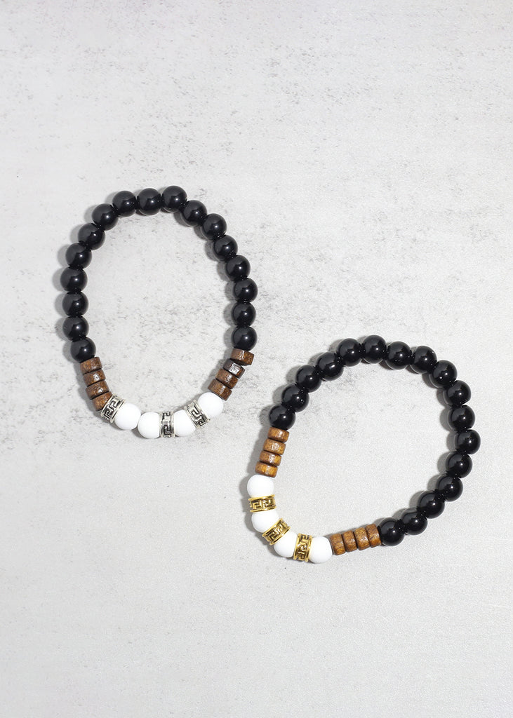 Elevate your accessory game with the Harmony Beaded Bracelet, a stylish fusion of natural elegance and modern design. This bracelet features a balanced mix of glossy black onyx beads, earthy wooden beads, and crisp white stone accents, creating a timeless piece that complements any outfit. The Greek key-patterned metal spacers comes in silver and gold tones and it adds a touch of sophistication, making these bracelets perfect for both casual and dressy occasions.