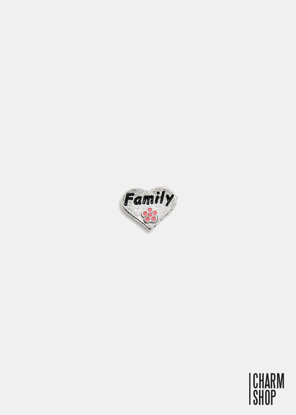 Dainty heart locket charm with "Family" engraved on it and a pink flower under it. A cute way to keep your family close to your heart everywhere you go. Makes a great gift or addition to anyone's personalized locket! ** Locket Not Included