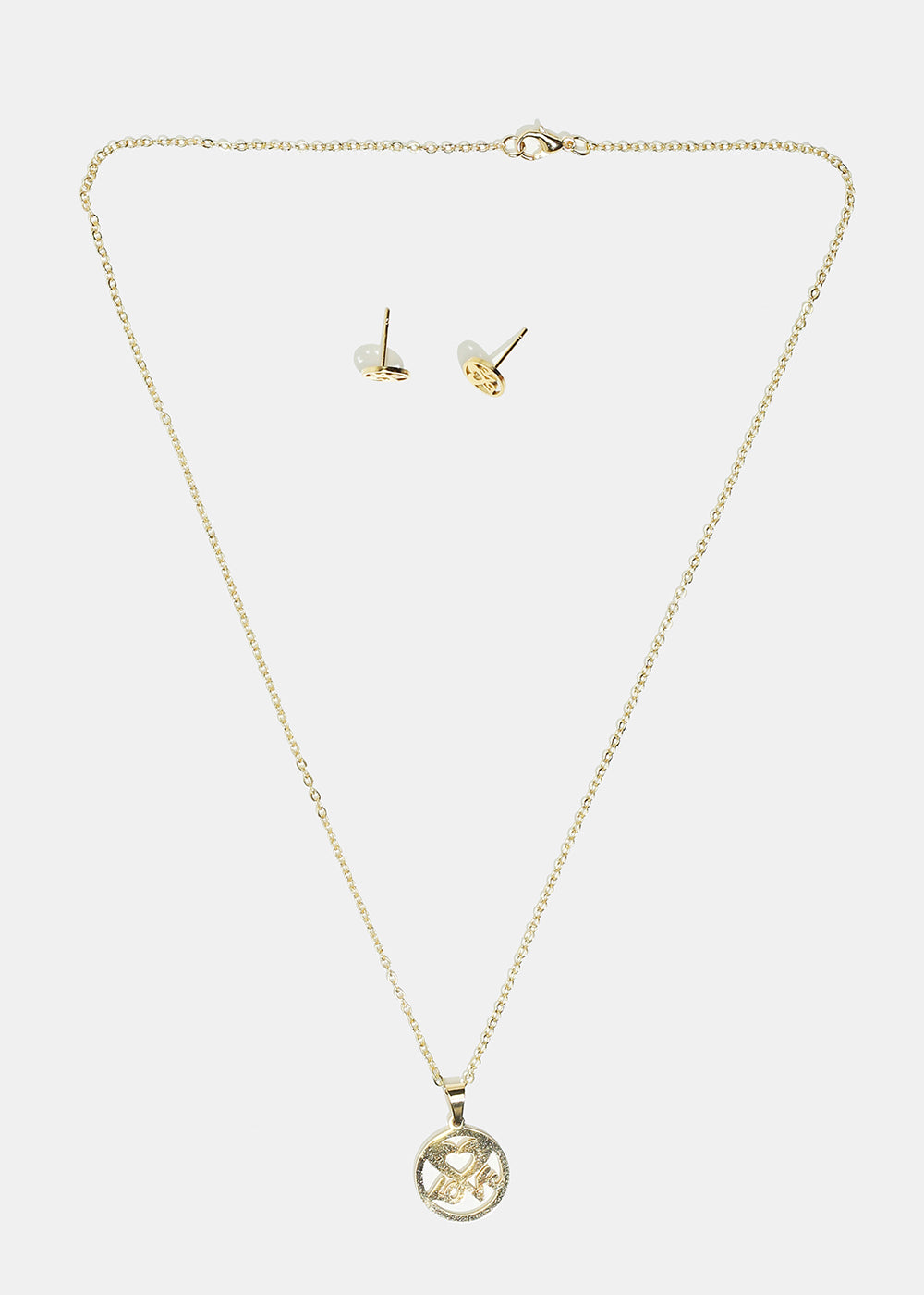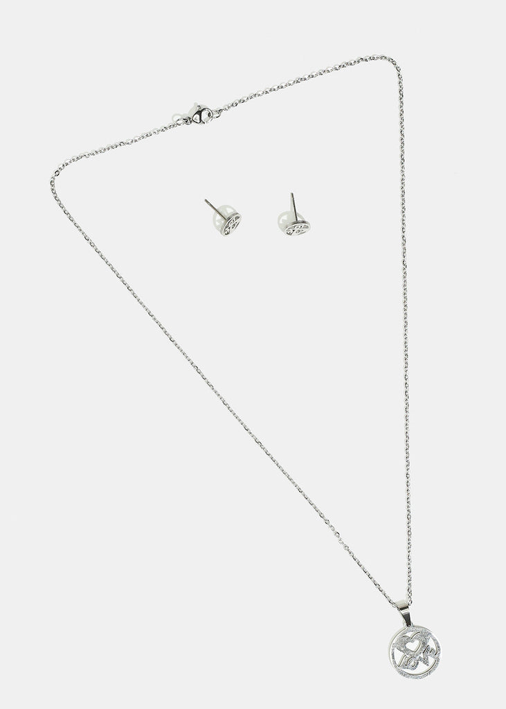 Heart & "LOVE" in Circle Necklace with Stud Earrings