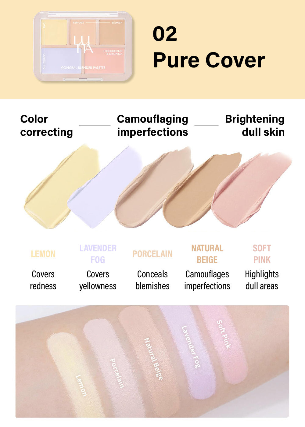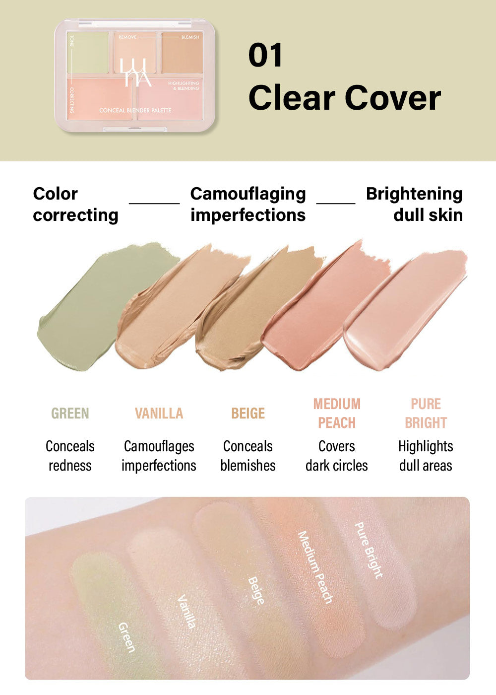 Pure Bright: Caprylic/Capric Triglyceride, Dipentaerythrityl Hexahydroxystearate/Hexastearate/Hexarosinate, Octyldodecanol, Mica, Synthetic Beeswax, Diisostearyl Malate, Silica, Polyglyceryl-2 Triisostearate, Synthetic Wax, VP/Hexadecene Copolymer, Microcrystalline Wax, Aluminum Hydroxide, 1,2-Hexanediol, Sorbitan Sesquioleate, Hydrogenated Castor Oil,Disteardimonium Hectorite, Caprylyl Glycol, Tocopheryl Acetate, Propylene Carbonate, Water, Butylene Glycol, BHT, Melaleuca Alternifolia (Tea Tree) Leaf Water, Madecassoside, Asiaticoside, Microcrystalline Cellulose, 4-Terpineol, Madecassic Acid, Asiatic Acid, Sodium Acetylated Hyaluronate, Titanium Dioxide (CI 77891), Iron Oxide Yellow, Iron Oxide Red, Iron Oxide Black, Bismuth Oxychloride