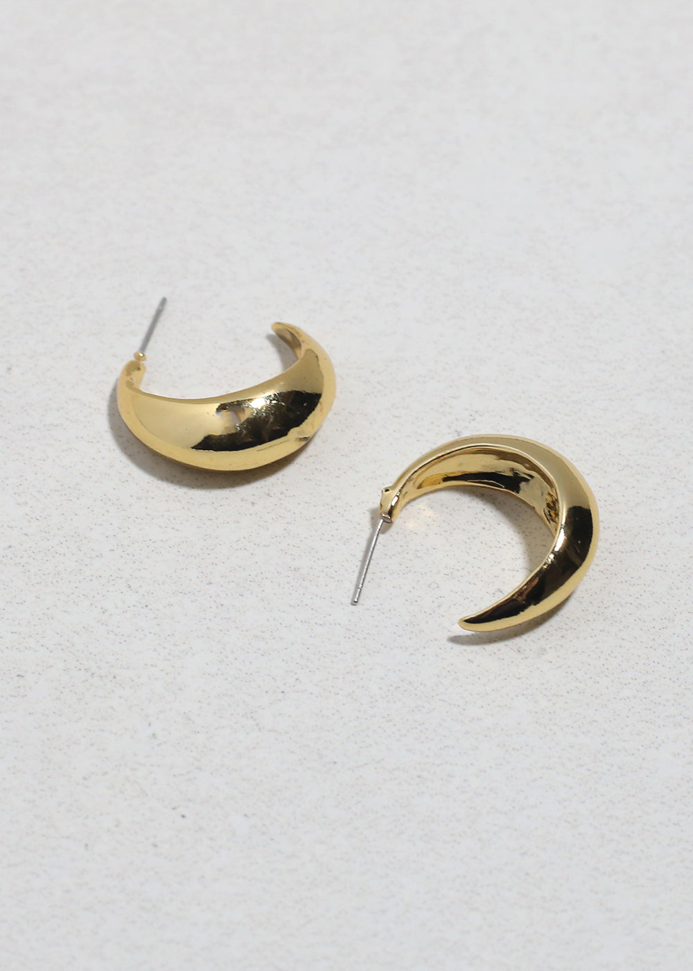 Finished in a high-shine polish and available in classic gold and silver, these lightweight earrings are perfect for everyday wear or dressing up a minimalist outfit. Their curved design hugs the ear beautifully, making them a go-to statement that feels chic, clean, and current.