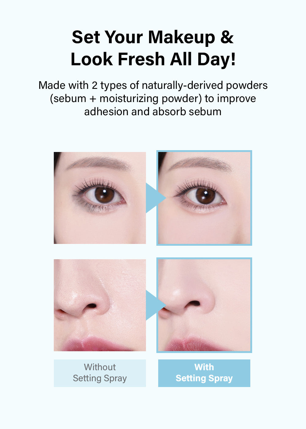 Made with 2 types of naturally-derived powders (sebum + moisturizing powder) to improve adhesion and absorb sebum.