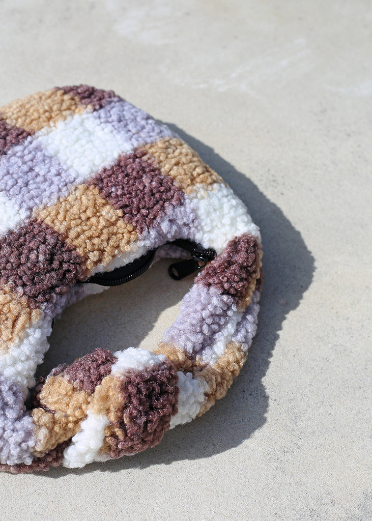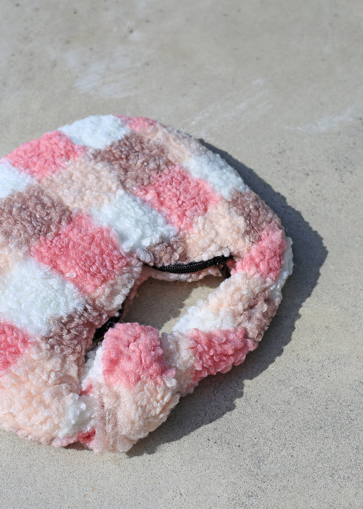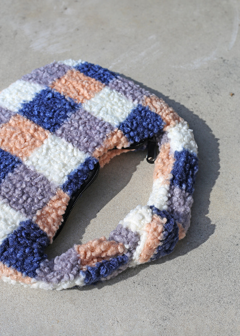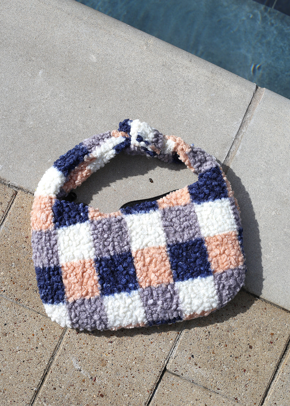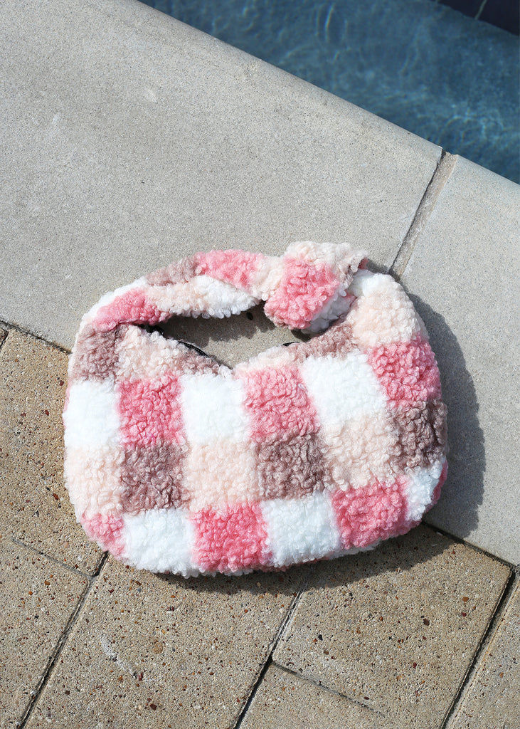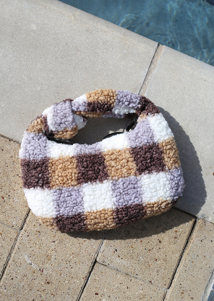 - soft, fuzzy, checkered mini - sized shoulder bag