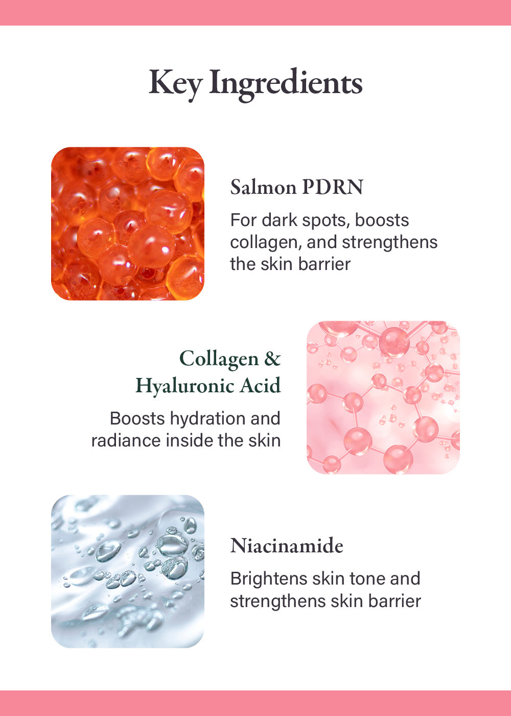 - Salmon DNA PDRN cares for uneven skin tone. Collagen and Hyaluronic Acid boost hydration and radiance within the skin, while Niacinamide promotes a healthy-looking complexion.