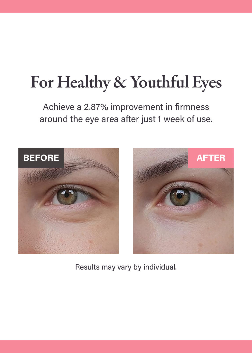 - Firmness around eye area improved by 2.87%, and moisture around eye area improved by 22.5% after 1 week of use.