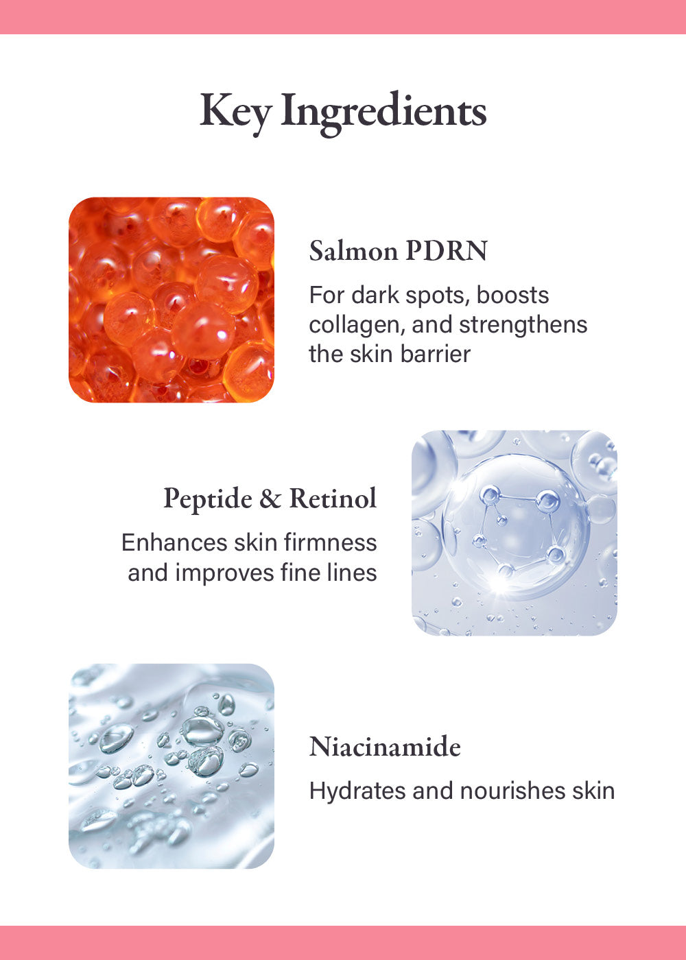 - This eye cream is formulated with Niacinamide, Peptide, Retinol, and Salmon PDRN that help reduce the appearance of darkened areas and improve dull eye areas with intensive hydration.