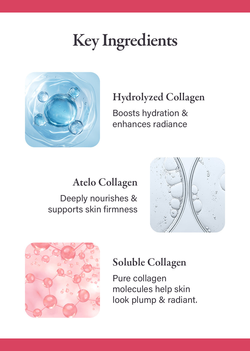 This toner is enriched with hydrolyzed collagen, atelo collagen and soluble collagen to improve skin elasticity for supple skin. It also contains hyaluronic acid, sodium hyaluronate, niacinamide and glycerin to supply and retain moisture while improving skin radiance. Suitable for various skin types including sensitive skin.