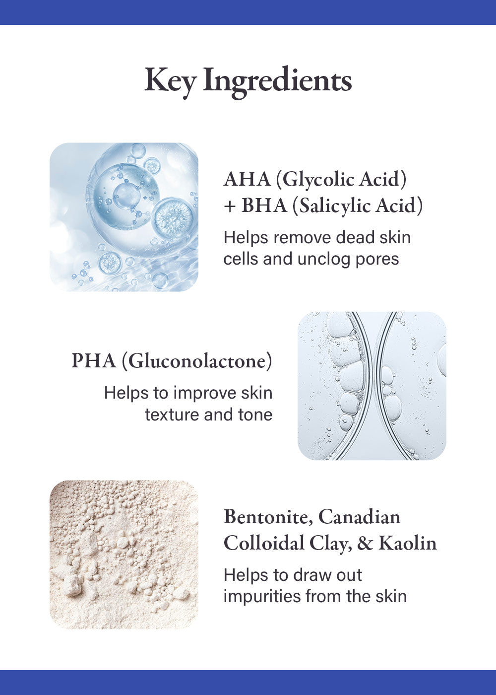 - A mud pack mask formulated with AHA, BHA, and PHA that strongly absorbs the blackhead, sebum, and dead skin cells within 3 minutes.