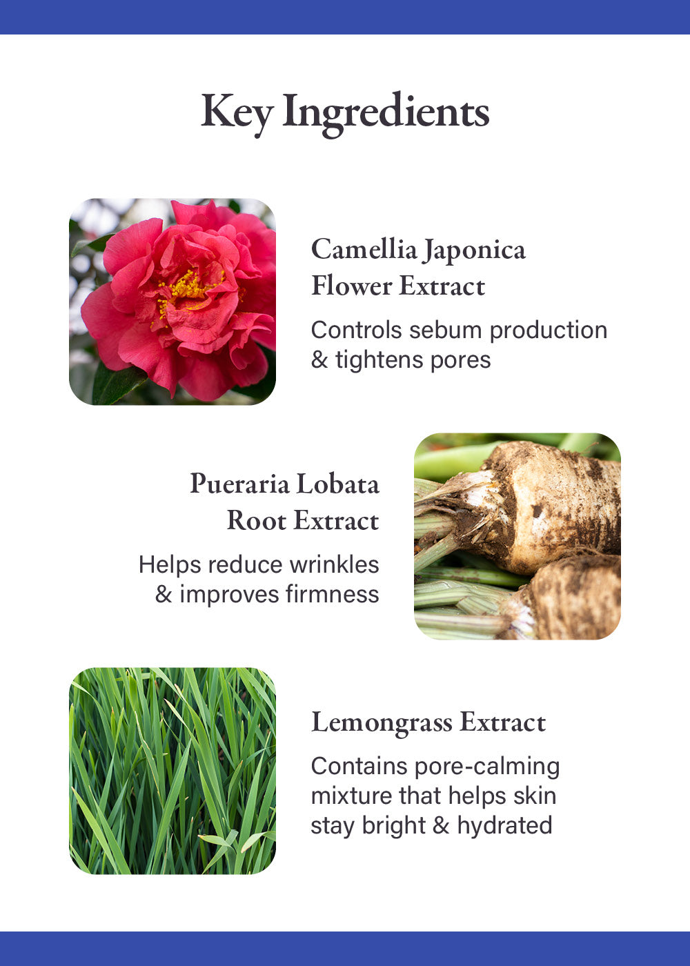 - Formulated with camellia flower extract to control sebum production and tighten pores.