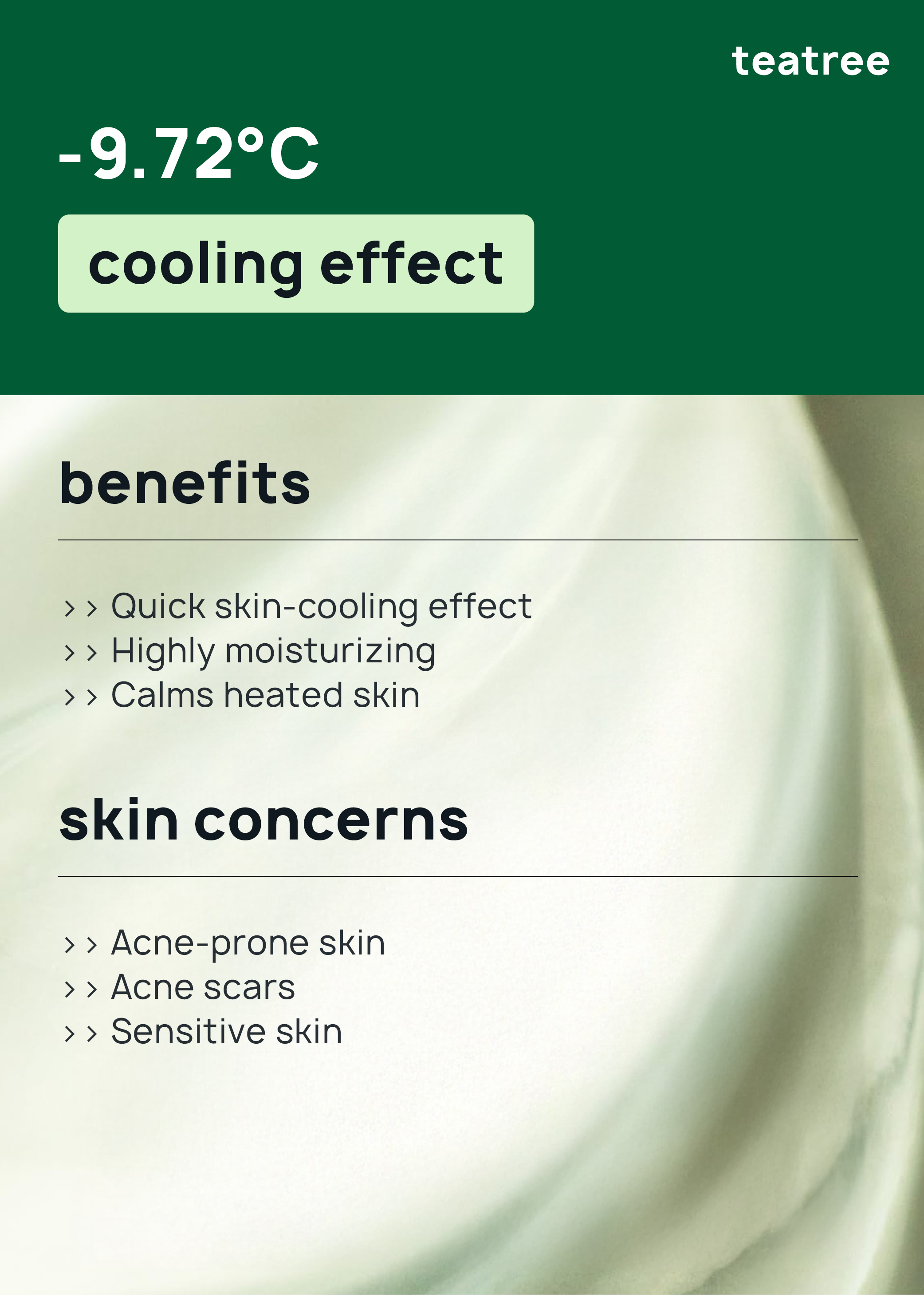 Water, Dipropylene Glycol, Glycerin, 1,2-Hexanediol, Panthenol, Arginine, Carbomer, Hydroxyacetophenone, Polyglyceryl-10 Laurate, Melaleuca Alternifolia (Tea Tree) Leaf Extract, Aminobutyric Acid, Ammonium Acryloy/dimethyltaurate/VP Copolymer, Pro-panediol, Butylene Glycol, Pantolactone, Melaleuca Alternifolia (Tea Tree) Leaf Oil, Glyceryl Acrylate/Acrylic Acid Copolymer, Disodium EDTA, Melaleuca Alterifolia (Tea Tree) Leaf Water, Sodium Hyaluronate, Glyceryl Glucoside, Lactobacillus Ferment. Melaleuca Alterifolia (Tea Tree) Extract, Tremella Fuciformis Polysaccharide, Hydrogenated Lecithin, Pantothenic Acid, Perilla Frutescens Leaf Extract, Taraxacum Officinale (Dandelion) Rhizome/Root Extract, 4-Terpineol