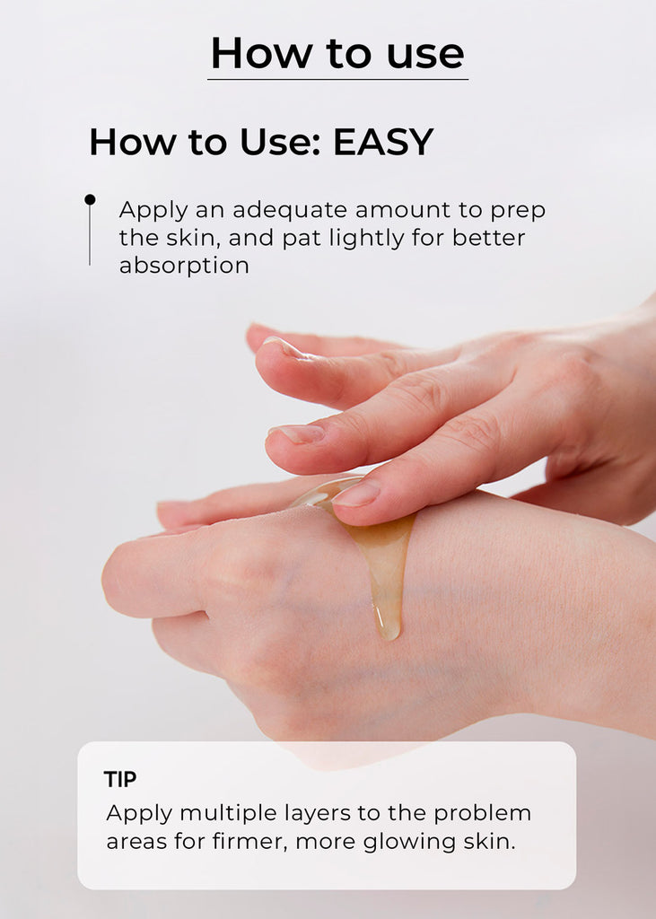 After cleansing and toning, apply an adequate amount to skin. Lightly pat to enhance absorption.