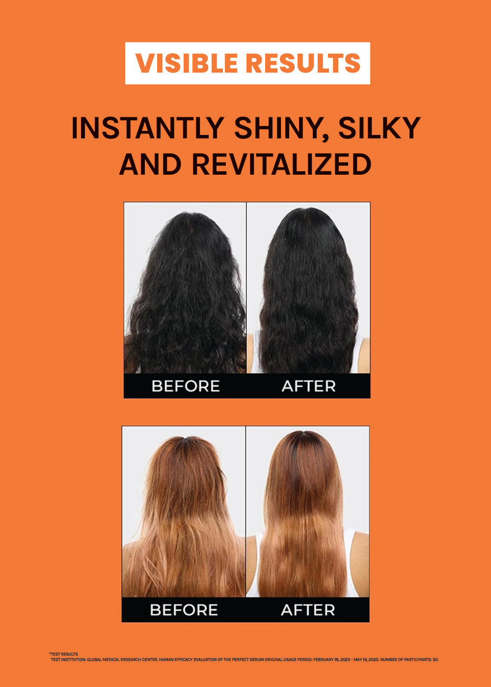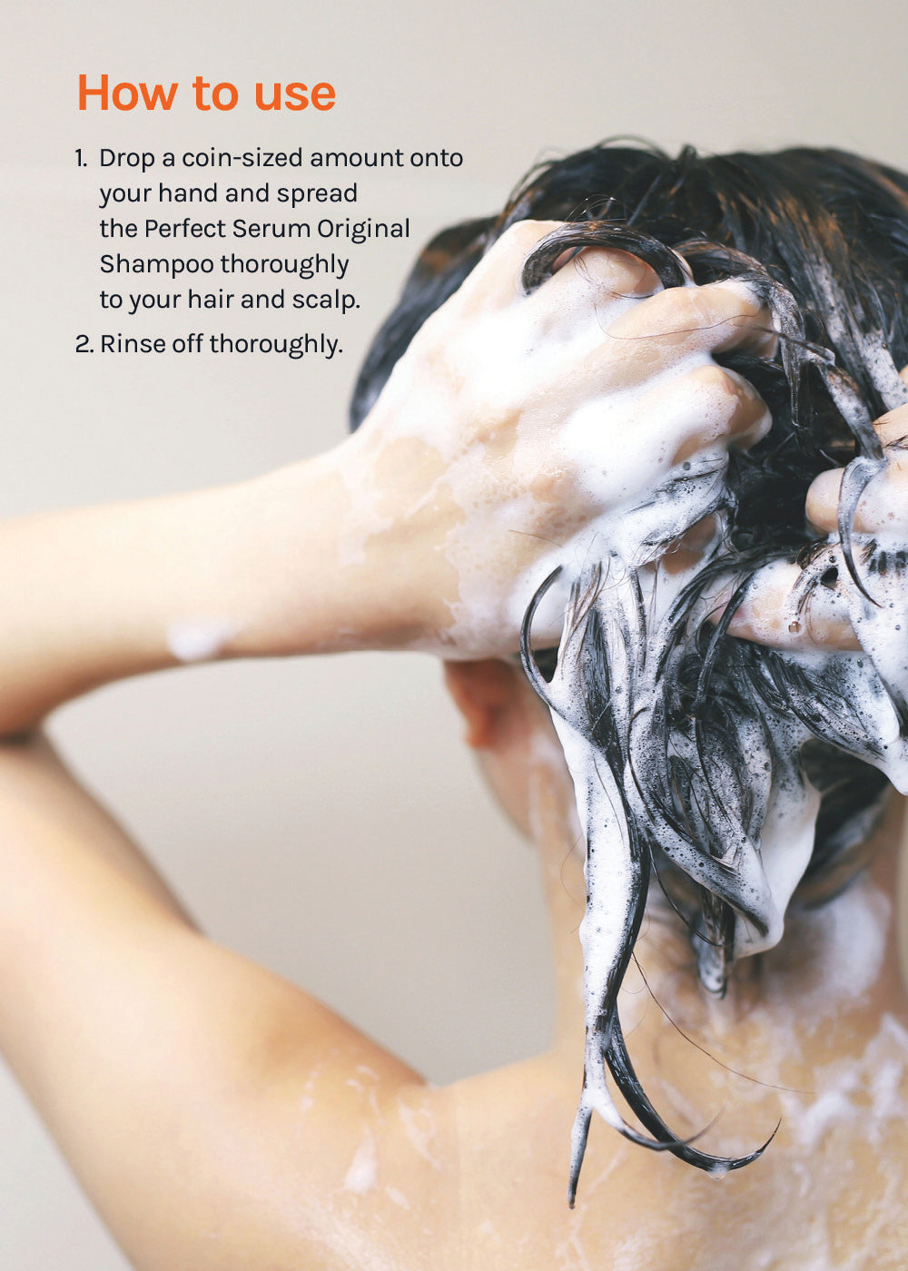 Drop a coin-sized amount onto your hand and spread the Perfect Serum Original Shampoo thoroughly to your hair and scalp. Rinse off thoroughly For best results, follow with the Perfect Serum Original Conditioner.