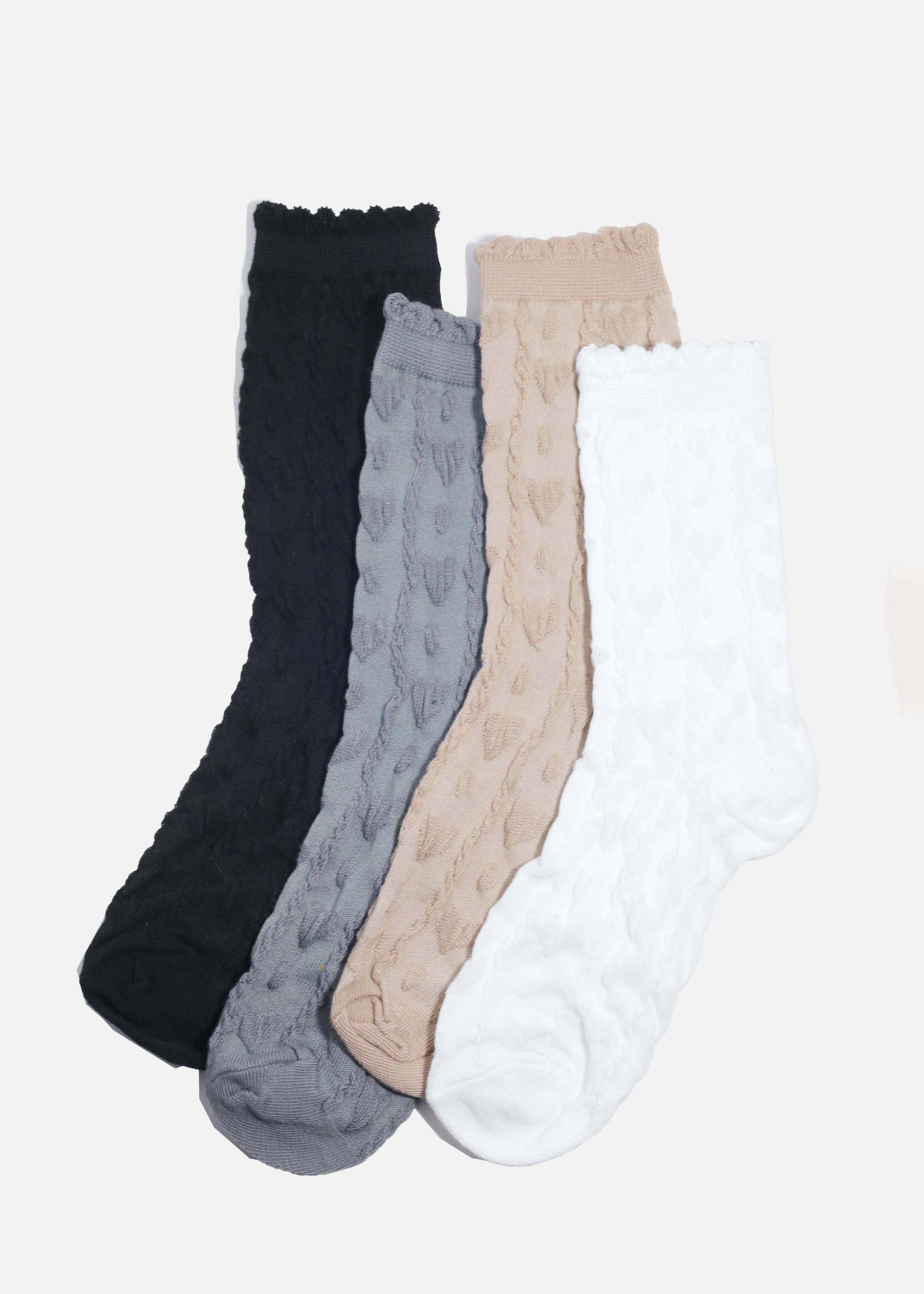 Add a touch of charm to your everyday essentials with these Knitted Heart Crew Length Premium Socks. Made from 100% cotton, these cozy socks are soft, breathable, + gentle on the skin, perfect for all-day wear. Featuring a delicate knitted heart design, they bring a sweet + stylish twist to a classic crew sock. Lightweight yet durable, these socks are versatile enough for lounging at home or stepping out in style.
