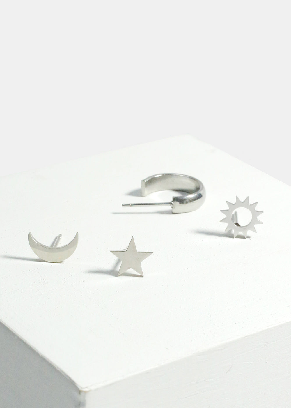 Mix and Match 4 Piece Earring Set with Moon, Star, Stud and a mini hoop in silver.