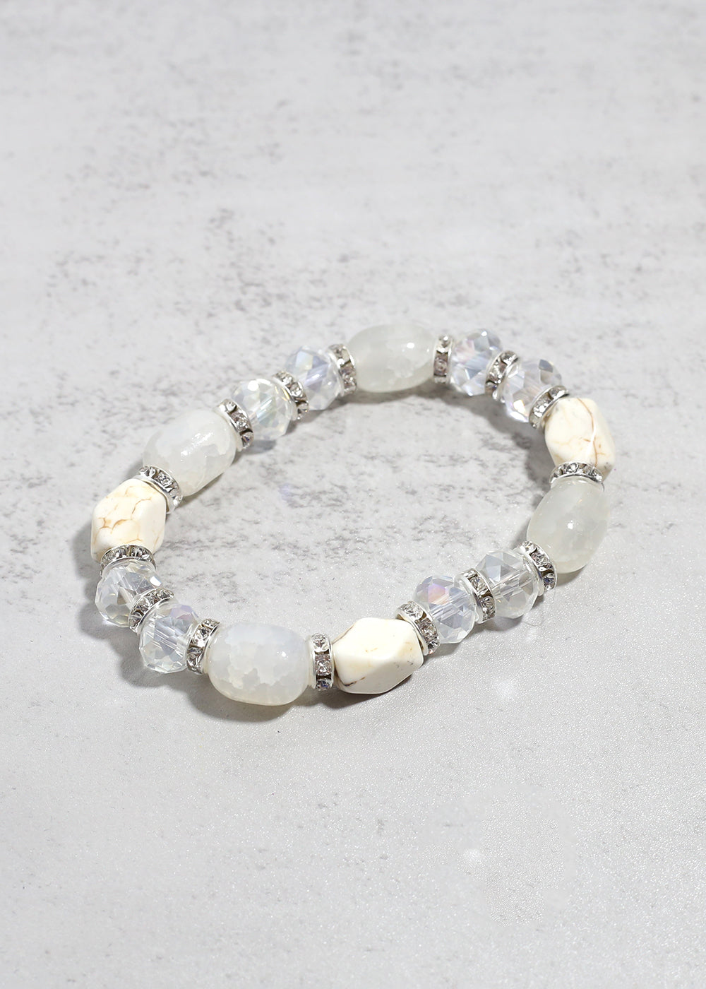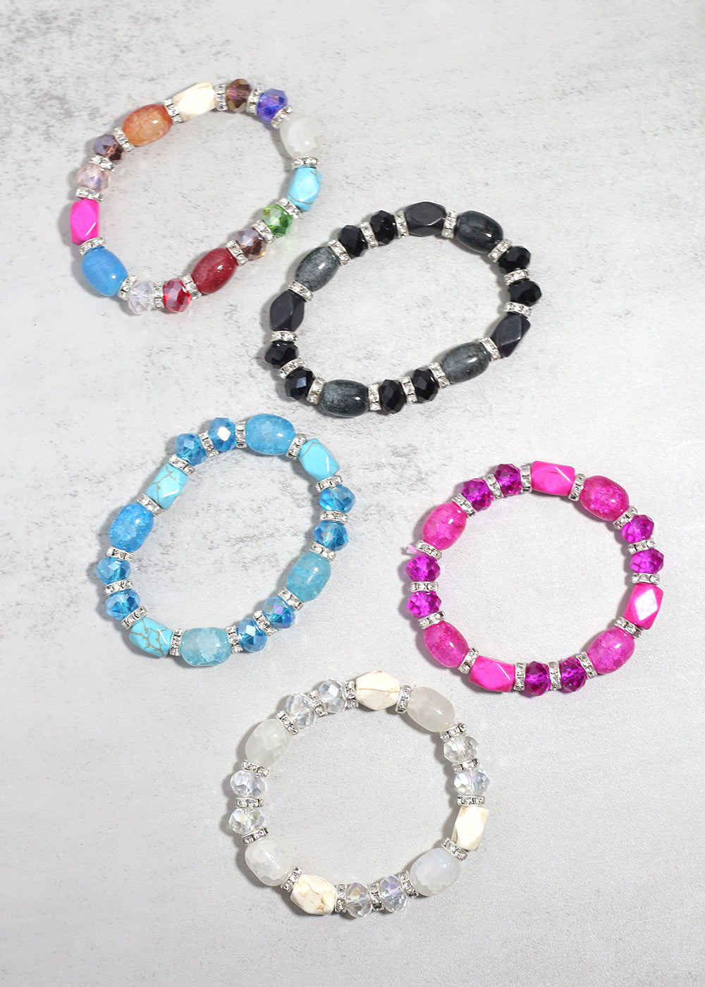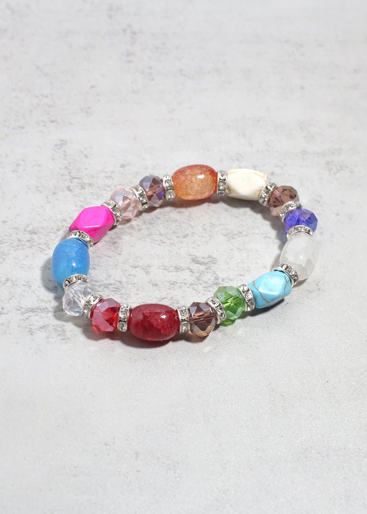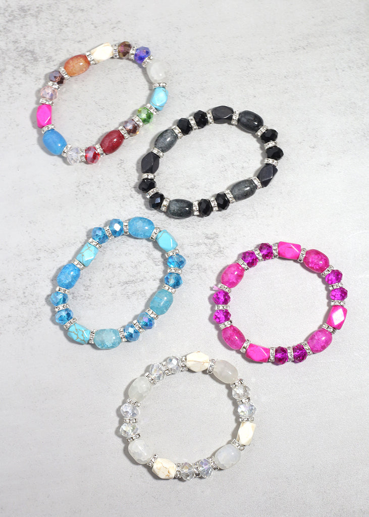 Add a burst of color and positive energy to your look with this stunning Mixed Gemstone Stretch Bracelet. Featuring a dazzling array of semi-precious-style beads in bold, radiant hues, each bracelet is beautifully accented with sparkling rhinestone spacers for extra shine and elegance. Whether you're drawn to calming blues, passionate pinks, classic black, or dreamy whites, there’s a unique color combination to match your mood and style.
