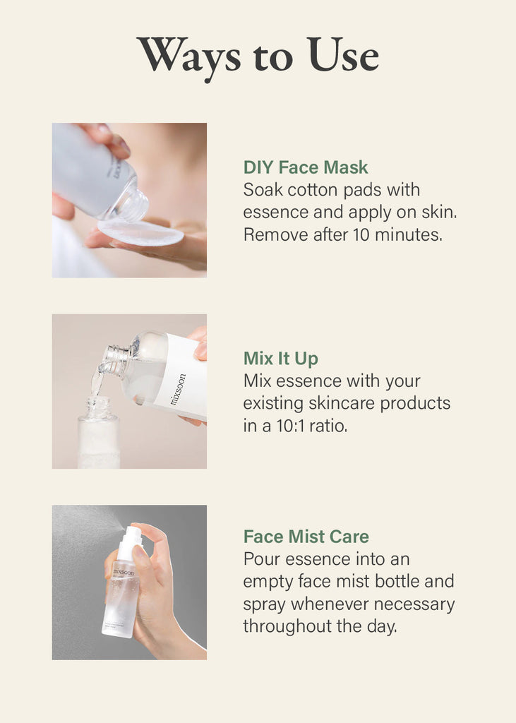 - Gently massage and tap the essence into your skin until fully absorbed.