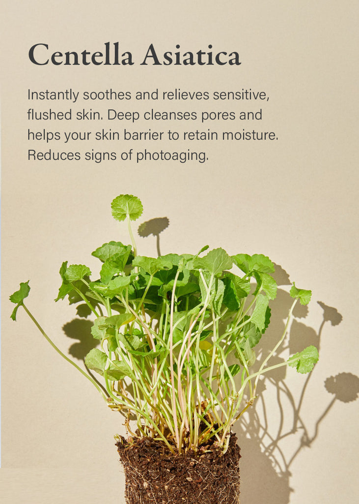 Contains 100% Centella Asiatica Extract. Helps soothe and repair irritated skin and also increase skin moisture promoting collagen synthesis to keep skin firm and supple. Recommended for inflamed skin and acne, damaged skin, dull skin with uneven skin tone, and aging skin.