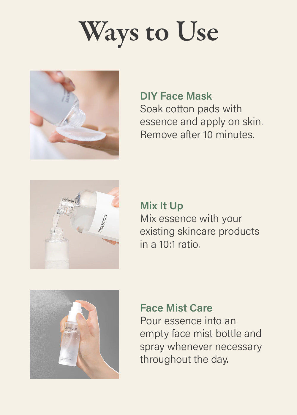 - Gently massage and tap the essence into your skin until fully absorbed.