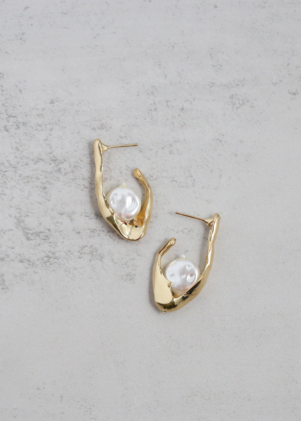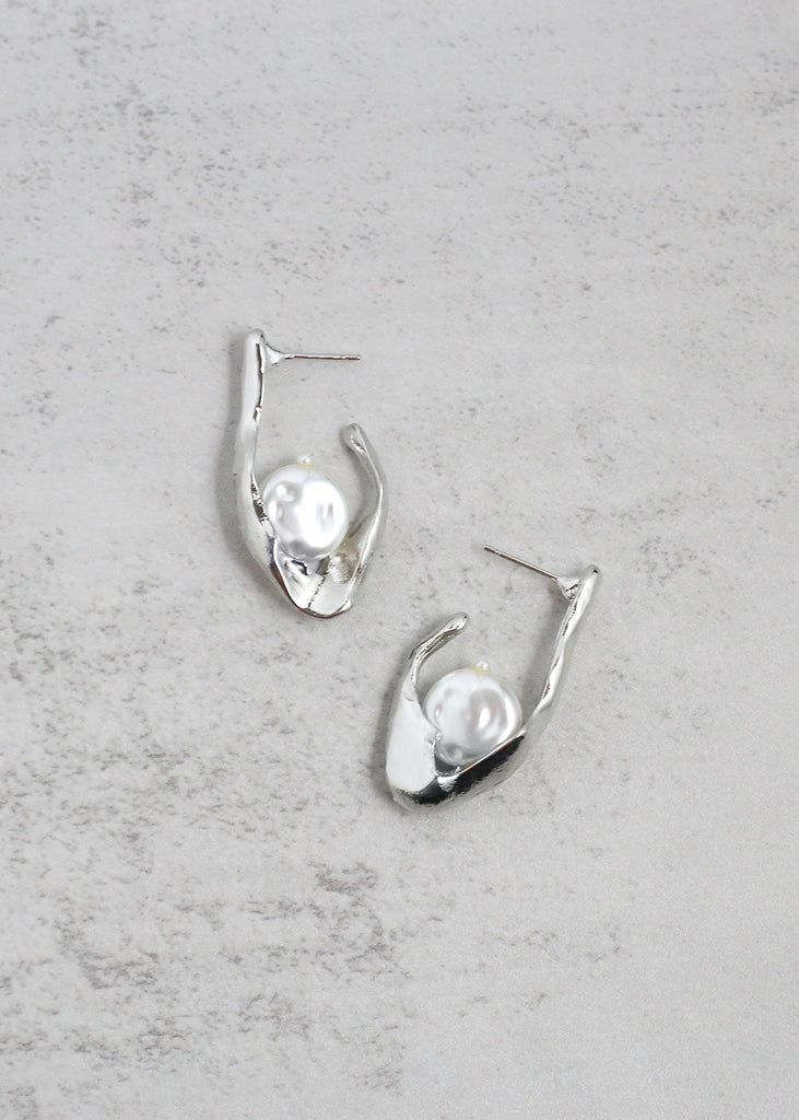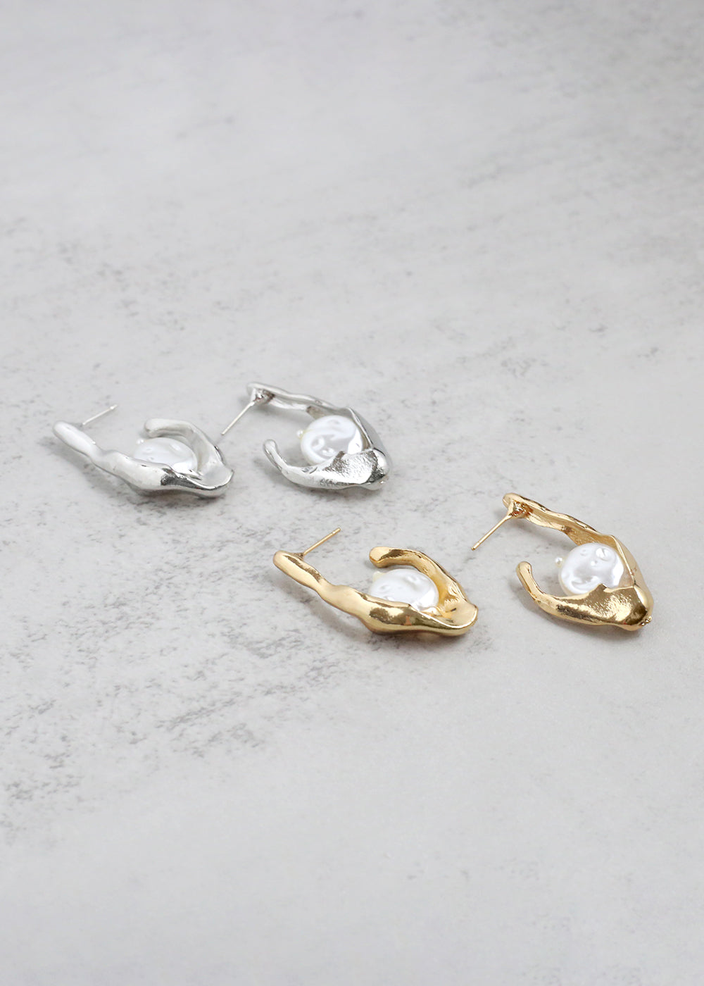 Make a bold statement with these Textured Pearl Dangle Earrings, featuring an organic, sculptural hoop design with a luminous pearl nestled inside. Available in gold and silver, these earrings blend modern elegance with a touch of nature-inspired artistry. The asymmetrical, molten-metal effect creates a unique, high-fashion aesthetic, perfect for trendsetters who love statement jewelry.