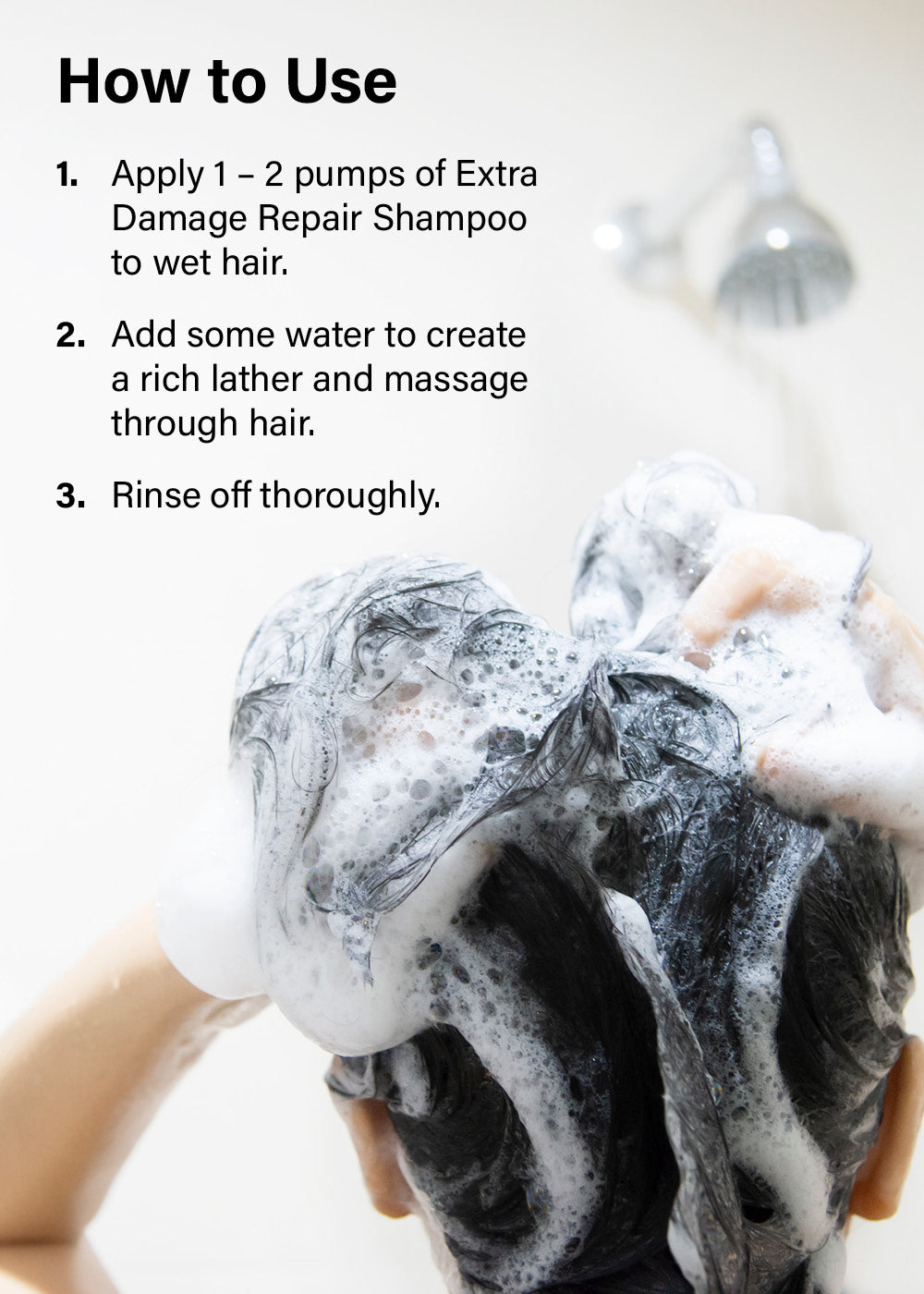 Apply 1–2 pumps of Extra Damage Repair Shampoo to wet hair. Add water to create a rich lather and massage thoroughly from roots to ends. Rinse well.