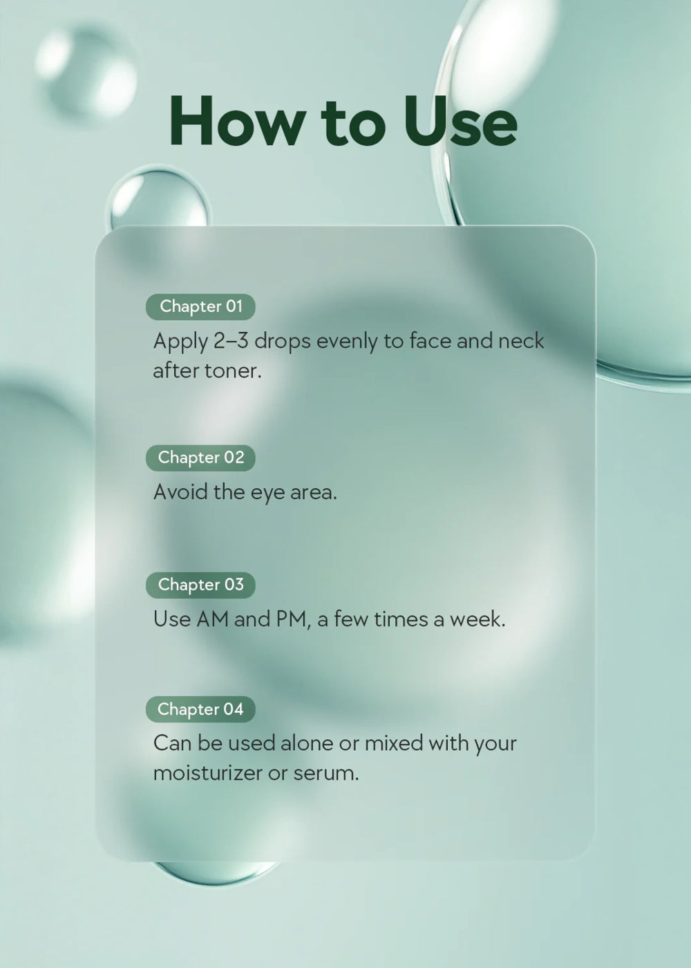 - Apply 2-3 drops evenly to face and neck after toner. Avoid the eye area.