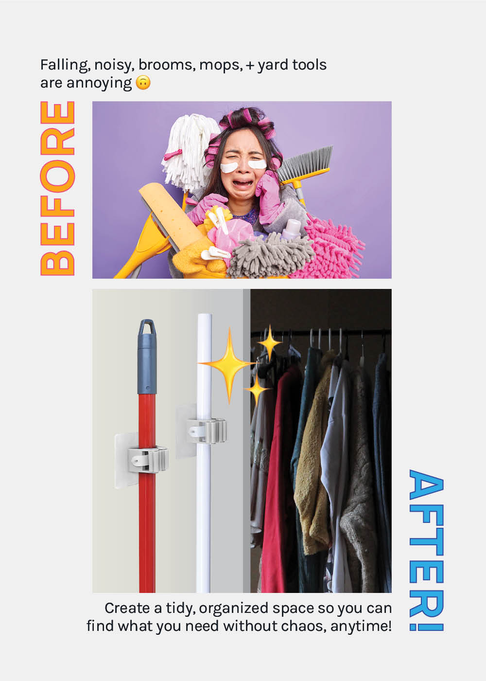 - These clips are adjusting and perfect to hang your brooms, mops, dusters to the wall to keep organized and clean
