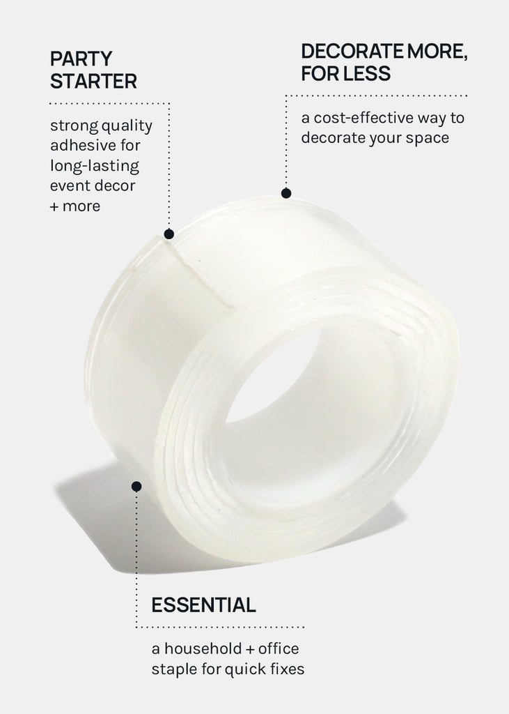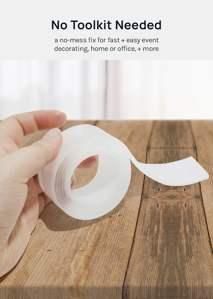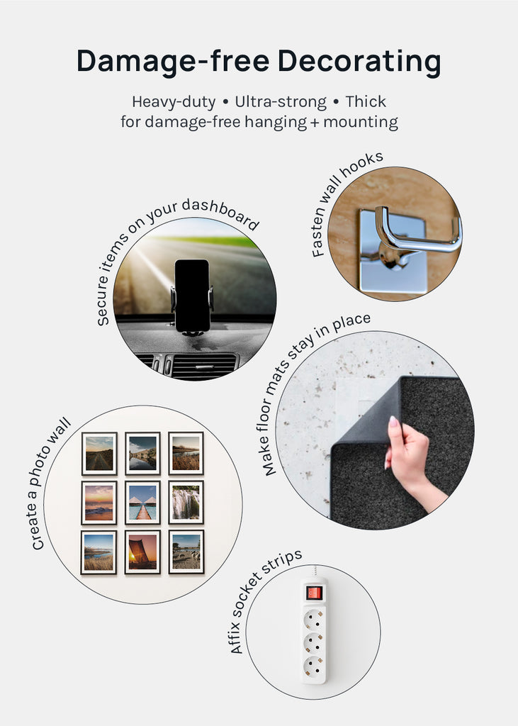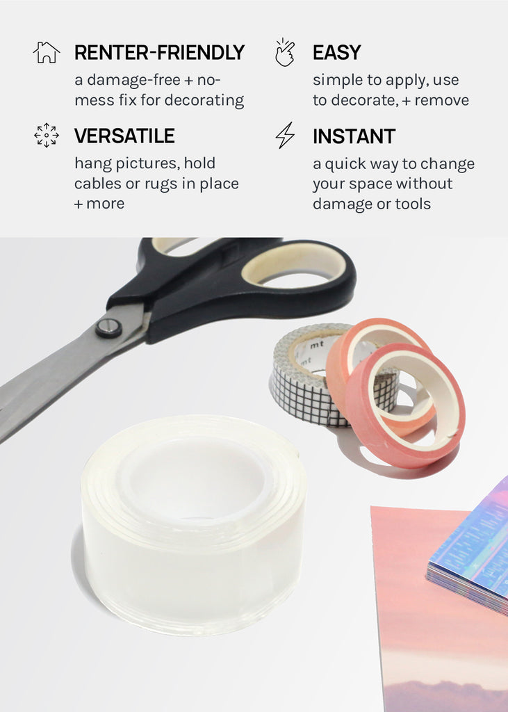 - Heavy-Duty Double-Sided tape has ultra-strong grip + is a no-mess alternative to drilling holes + hammering nails.