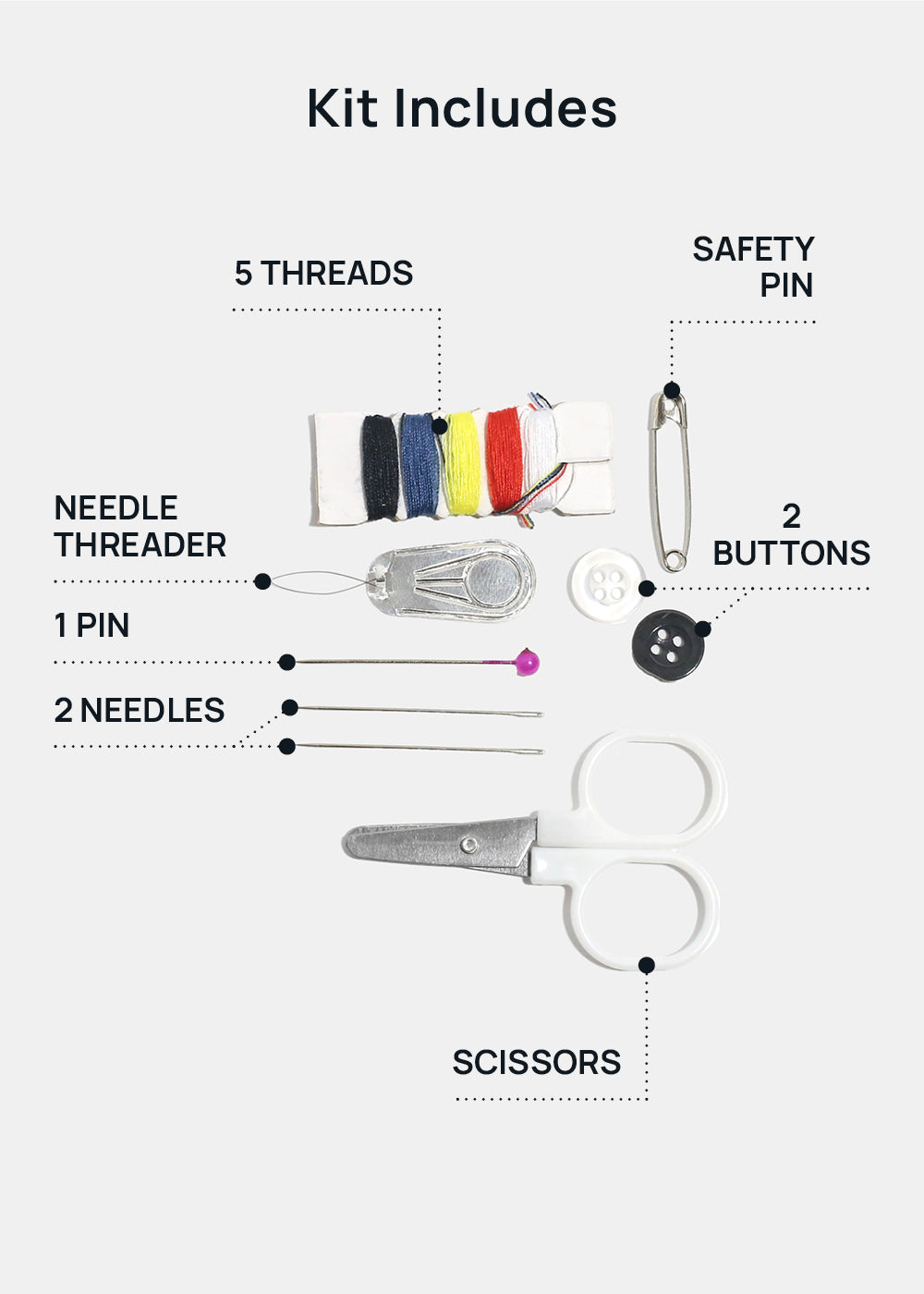 Includes: 5 threads, 2 needles, 1 pair of scissors, 1 pin, 1 safety pin, 1 black button, 1 white button, + 1 needle threader