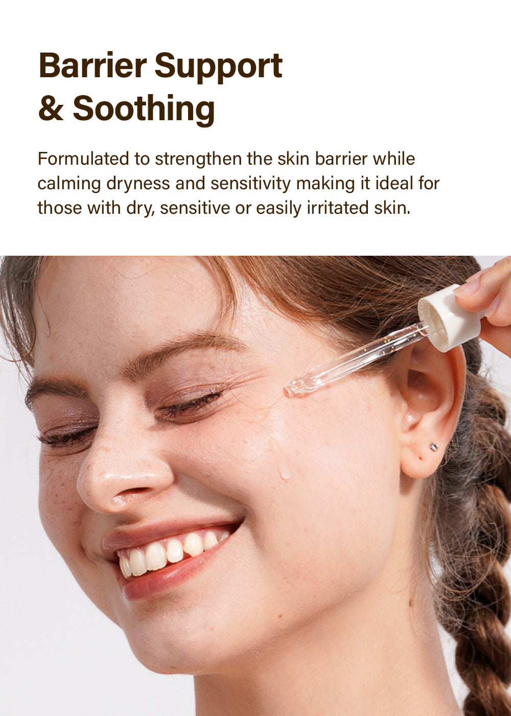 Formulated to strengthen the skin barrier while calming dryness and sensitivity making it ideal for those with dry, sensitive or easily irritated skin.