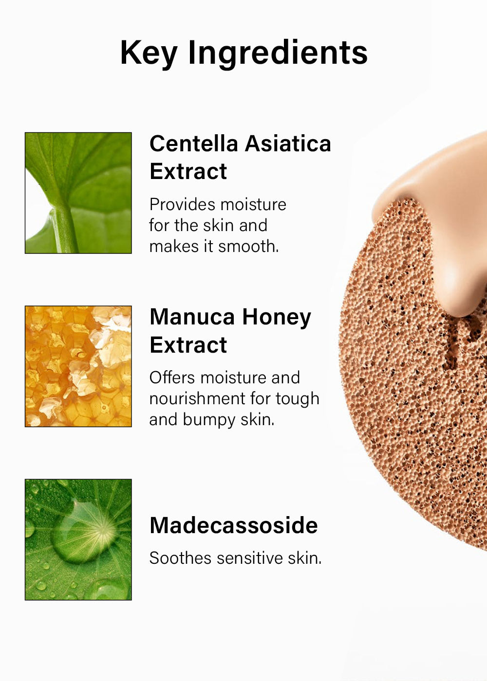 Enriched with Centella Asiatica, Manuka Honey, and Madecassoside, the formula nourishes and refines rough skin texture.