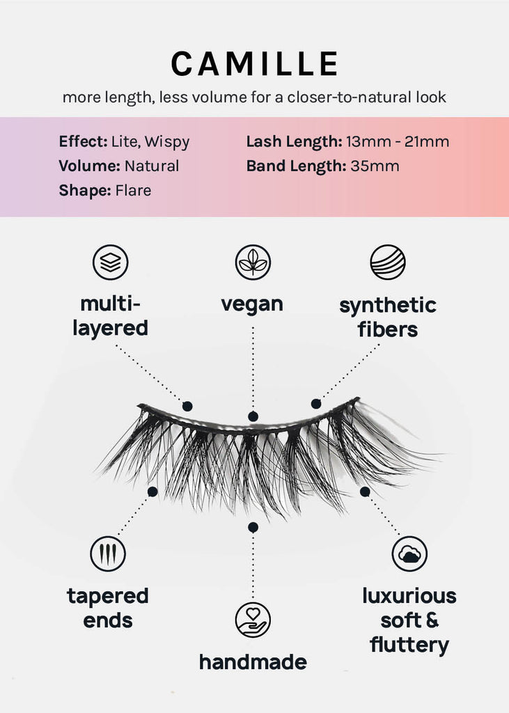 These lashes are vegan, cruelty-free, and made from synthetic fibers. The band is thicker, therefore can be reused multiple times with proper care and cleaning!