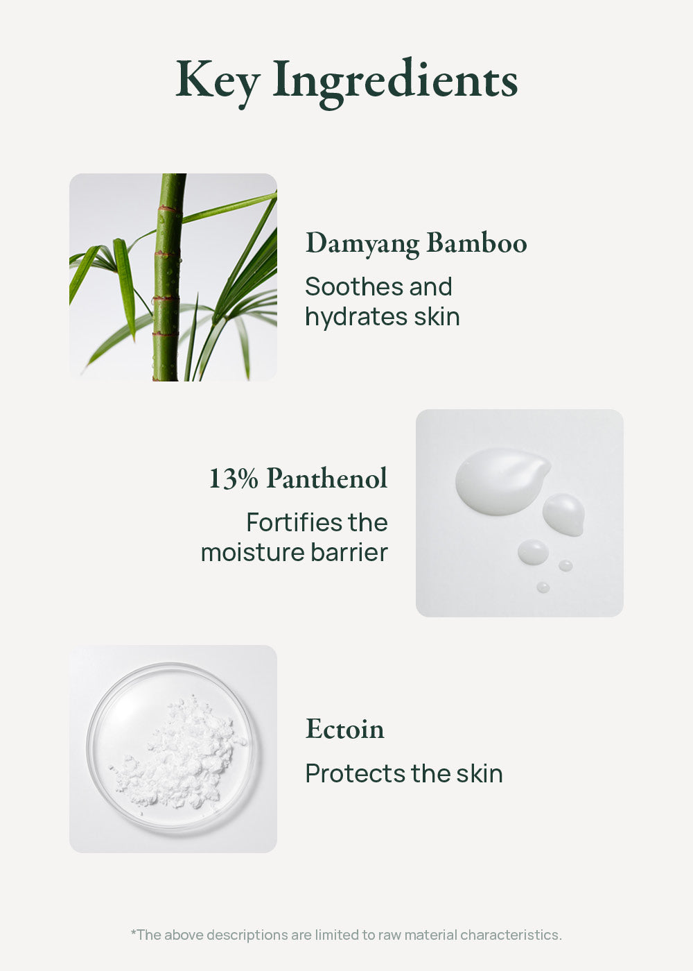 Formulated with Korean damyang bamboo, panthenol and ectoin, this serum replenishes moisture on skin to give it a hydrated and plump appearance. The light, non-sticky formula applies easily on skin without causing any irritation. This hypoallergenic product is suitable for various skin types including sensitive skin.