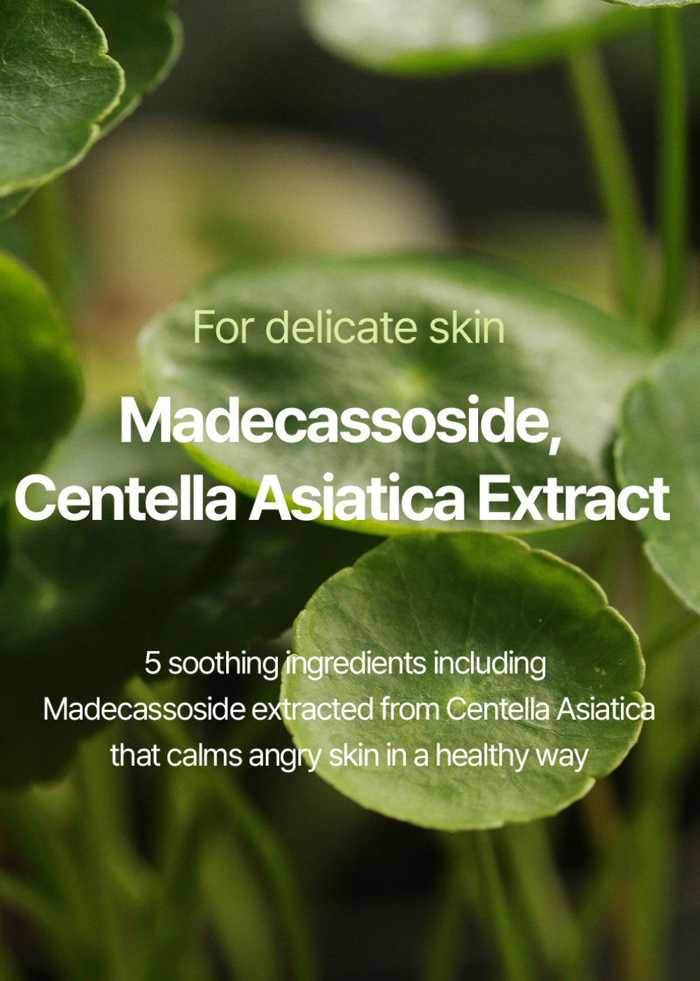 Through Centella Asiatica extract (also called as Cica or Madecassoside), Tea Tree and Lonicera Japonica Flower Extract, known as a representative soothing ingredient, that quickly calms angry skin in a healthy way and controls excess sebum also moisturizes irritated skin without worrying about irritation.