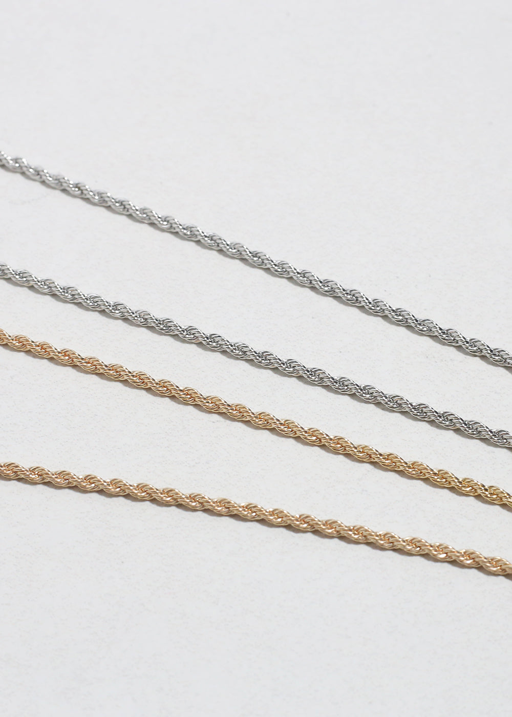 Timeless, versatile, and effortlessly stylish — this rope chain necklace is a must-have for any jewelry collection. Featuring a sleek twisted rope design, it catches the light beautifully and adds just the right amount of shine to any outfit. Available in both gold and silver finishes, this necklace can be worn alone for a minimalist look or layered with other chains for a trendy, stacked style.