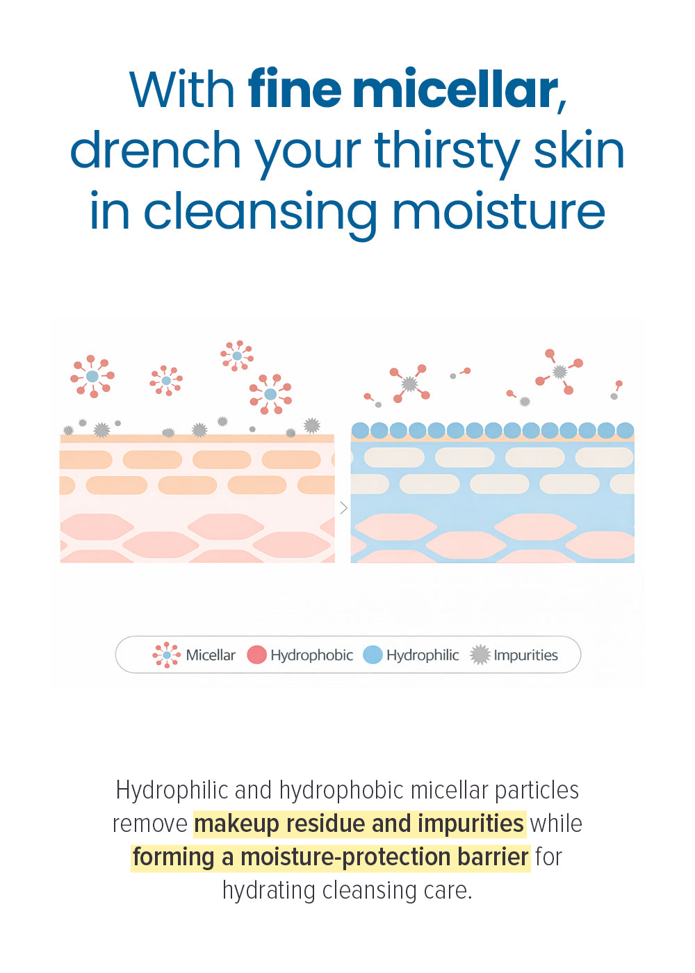 - Contains fine micellar particles to effectively remove impurities while hydrating skin.