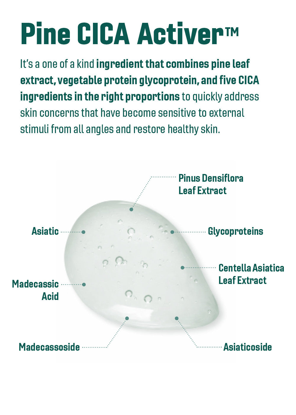 - With 80.4% Pine Cica Activer, a unique ingredient that combines Pine Leaf Extract, Vegetable Protein Glycoprotein, and 5-CICA ingredients, Pine Calming Cica Ampoule works swiftly to address skin troubles caused by external stimuli and to expedite skin restoration.