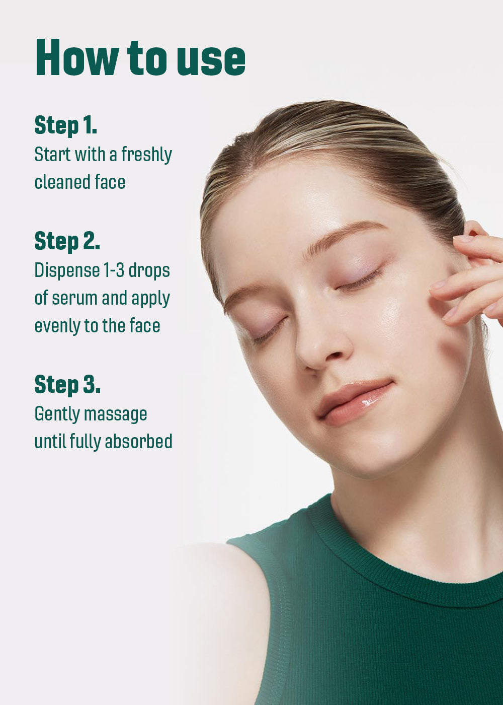 After toning, apply one to two drops on the face and gently tap until fully absorbed.