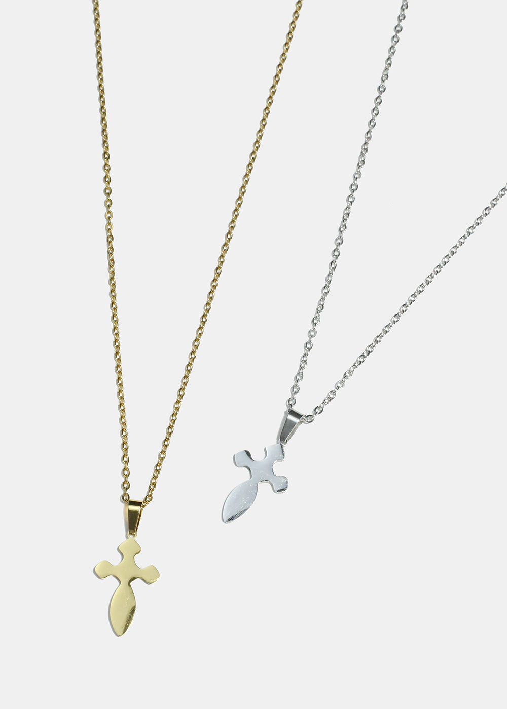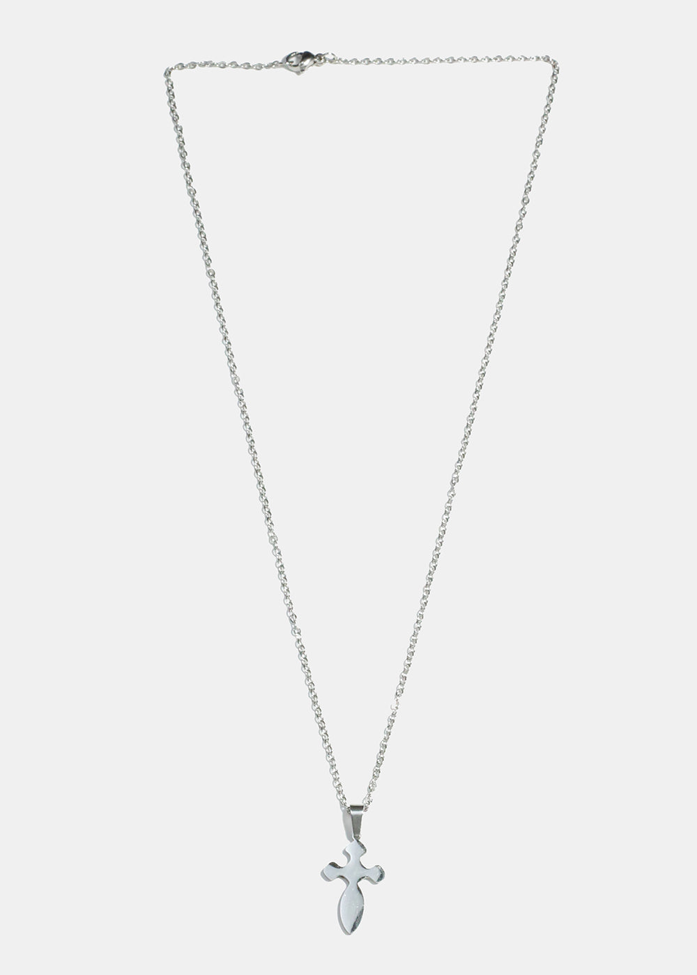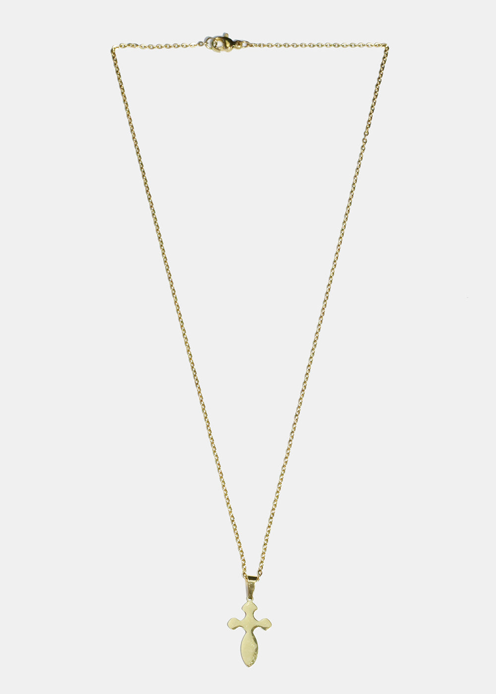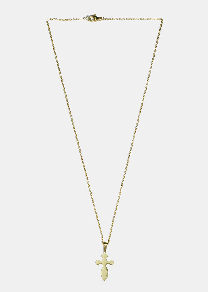 Rounded cross pendant necklace on a chain.