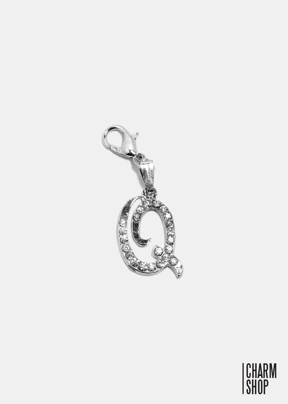 THIS SILVER AND CLEAR RHINESTONES ITALIC "Q" INITIAL ADDS THE PERFECT AMOUNT OF SHIMMER AND SPARKLE TO YOUR DANGLE CHARM BRACELET. IT'S A GREAT WAY TO REPRESENT YOUR INITIALS, A LOVED ONE, OR A TEAM. * CHAIN BRACELET NOT INCLUDED.