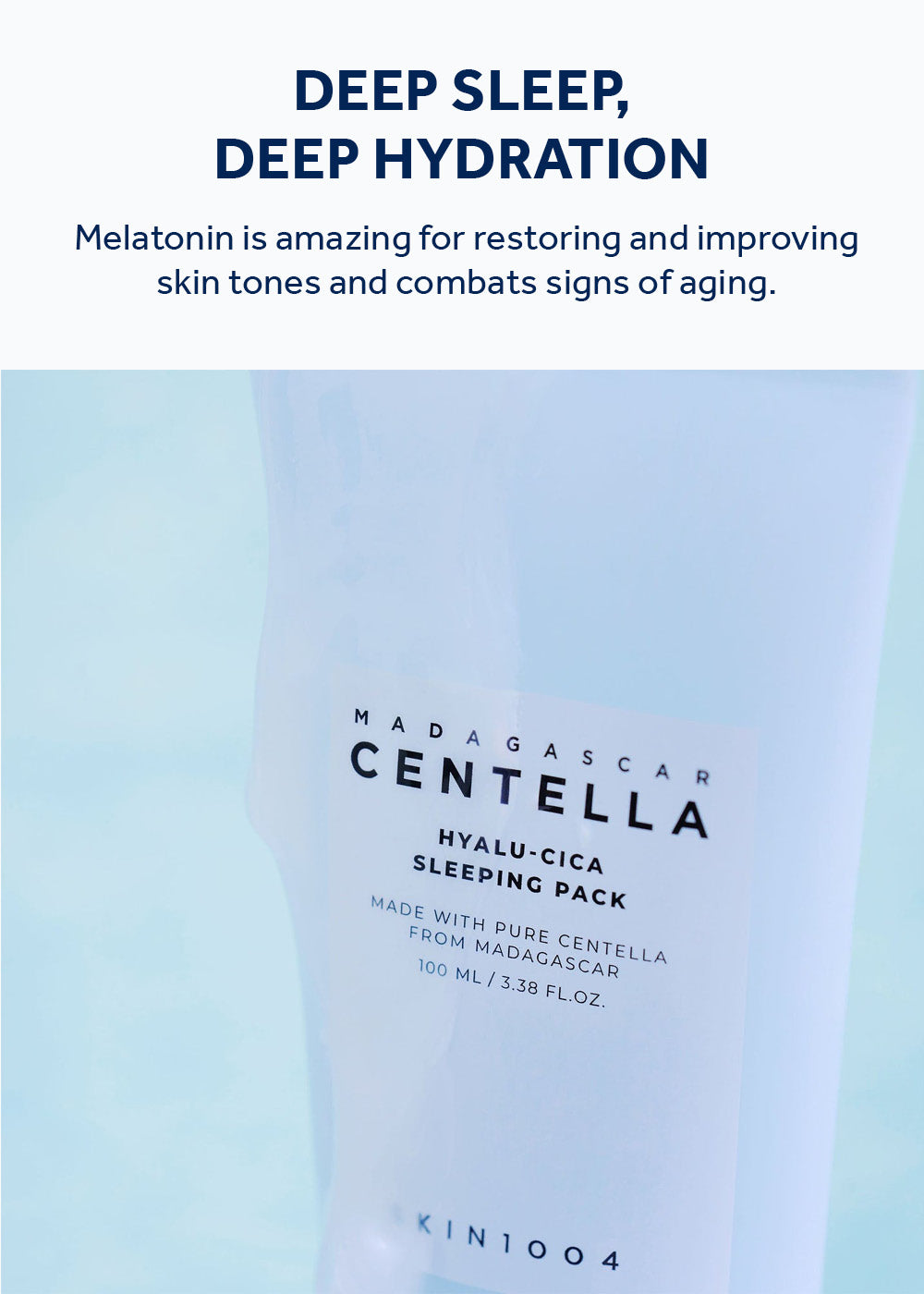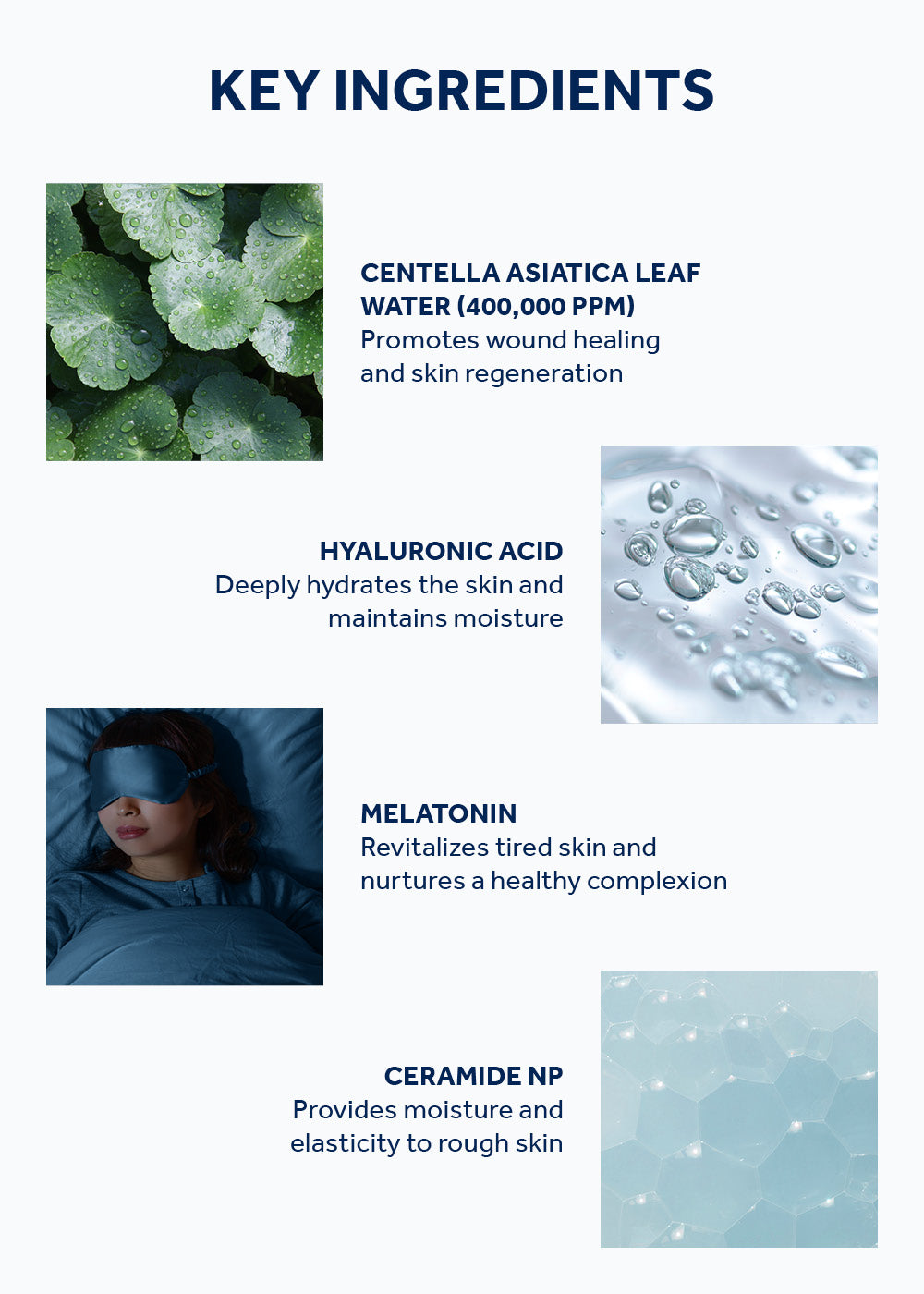 Centella Asiatica Leaf Water, Hyaluronic Acid, Melatonin, Ceramide NP